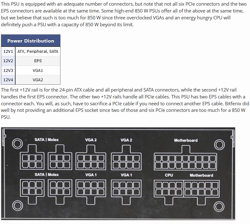 Kürzlich habe ich mein System um eine 6900XT bereichert, die ja 3x8 Pin Stromversorgung hat. Angeschlossen habe ich die am linken VGA1 mit 2x8 und am linken VGA2 mit 1x8. Für VGA1+2 stehen jeweils 2 Anschlüsse zur Verfügung, so dass ich die Karte auch komplett an VGA1 hätte anschließen können. Da ich auf meinem neuen Mainboard (MSI X570-A PRO AMD X570 So.AM4 Dual Channel DDR4 ATX) 2 CPU-Anschlüsse (8+4 Pin) habe, werde ich einen VGA Ausgang am Netzteil für das 2. Stromversorgungskabel der CPU benötigen.