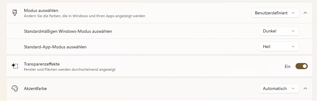 Was soll ich dazu sagen? Ich hab das Problem auf drei Rechnern mit Windows 11 und 25H2 (1x Laptop von der Arbeit, 1x PC und 1x Laptop von mir). Das ist mein Default Setting tagsüber und nachts geht es dann komplett auf Modus = Dunkel.Bodennebel schrieb:Ich habe das gerade mal getestet und bei geöffneten Teams den "Standard-App-Modus" von "Hell" auf "Dunkel" und anschließend wieder zurück umgestellt. Die Teams-Oberfläche wurde sofort geändert.