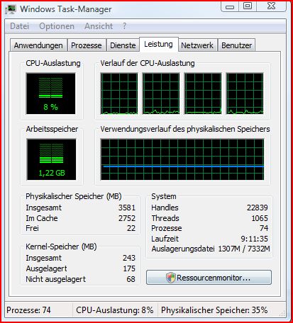 Überzeuge dich einfach selber davon und lass dich nicht von solchen Gespenstergeschichten davon abbringen. Du musst dir das so vorstellen, das was unter Vista schon im Arbeitsspeicher (in dem Bereich wo Cache steht) drinn ist muss nicht extra von der geschwindigkeitsmässg langsameren Festplatte aus gelesen werden und das sind immerhin um die 3 Gigabyte. Es ist in der Regel Board und Chipsatz abhängig wieviel Speicher unter 32bit letztendlich maximal adressiert werden kann , bei einem P35 Board sind es knapp 3,6GB siehe Bild.