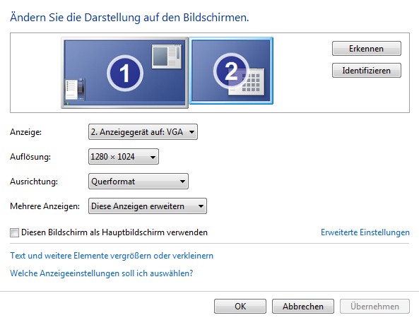1x 1280x1024 (erweitert) per Adapter von VGA an DVI --> läuft