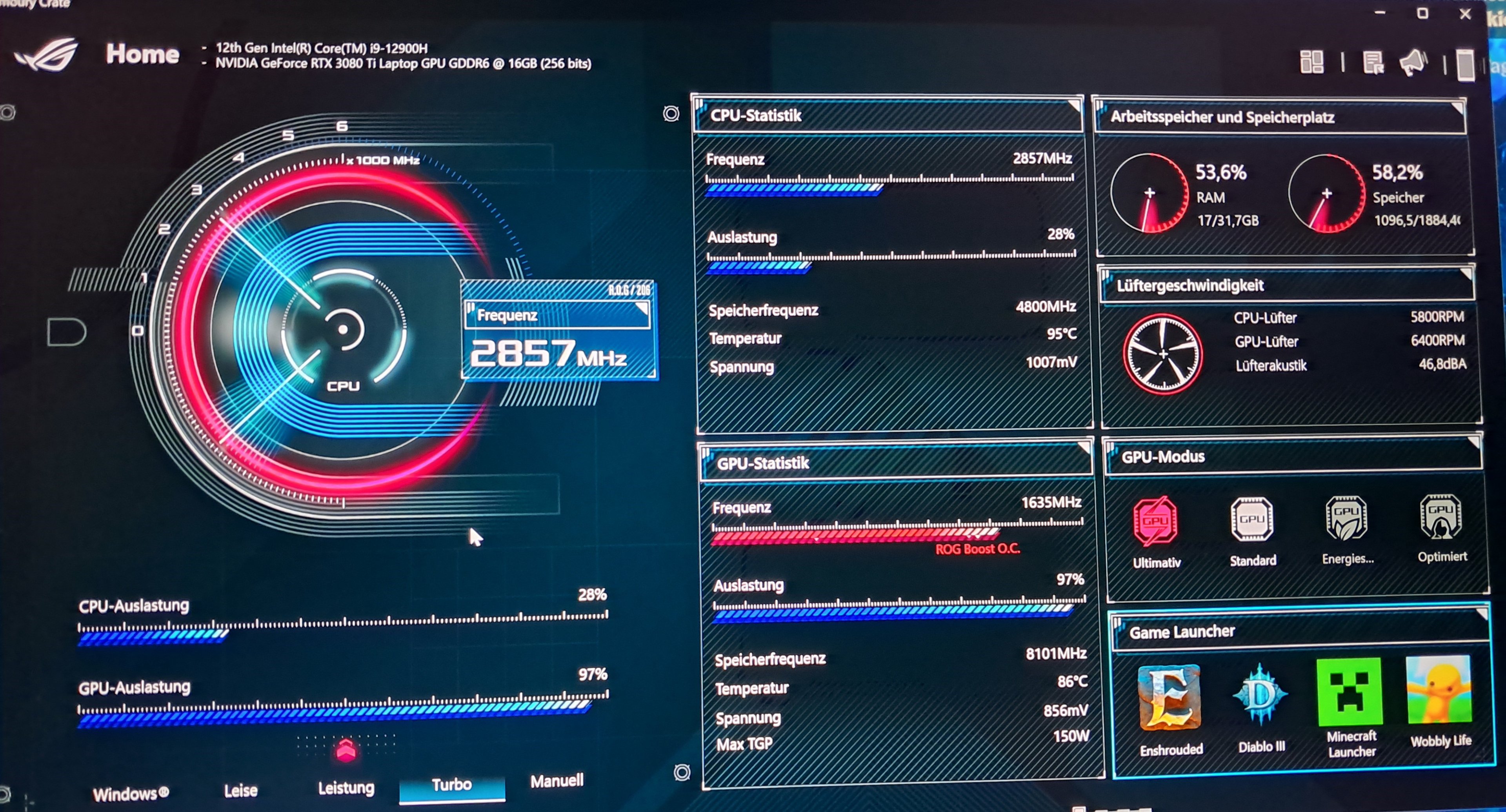 Nun habe ich mir im Dezember 2022 ein Notebook geleistet: ROG Strix Scar 17. Ich arbeite damit, was kein Problem dar stellt und ich spiele damit. Durch die starke Temperaturentwicklung glaube ich entstehen immer wieder Probleme.