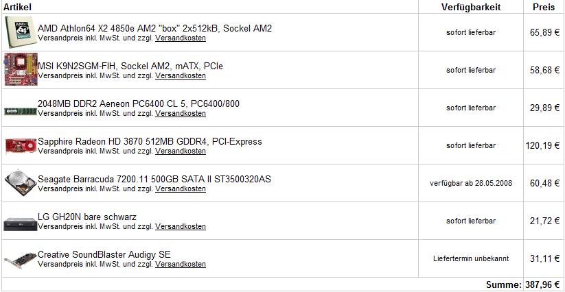 Kosten gesamt: --> 329€ (ohne Grafikk. und Netzteil)