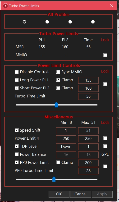 Hier habe ich zB 160W-155W eingestellt, du könntest mal PL1 100W und PL2 105W testen.