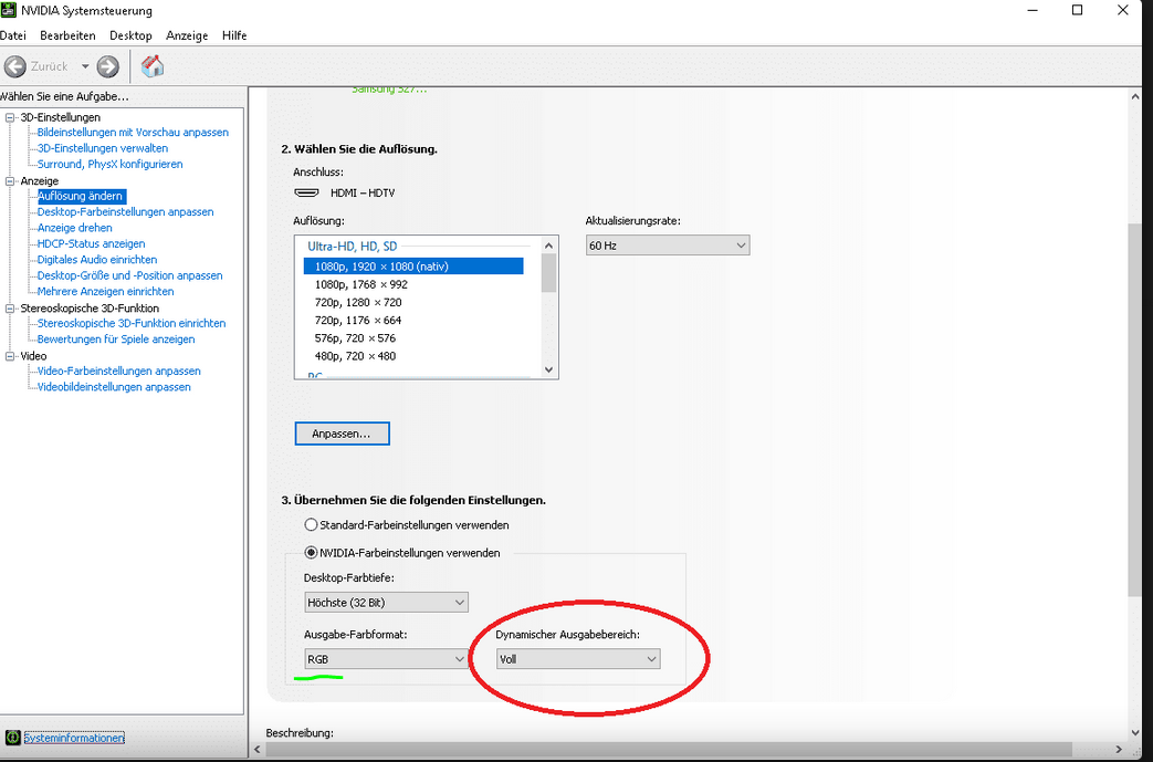 auf "Voll (Full RGB"), für einen PC-Monitor. Am HDMI wird ein TV erwartet.