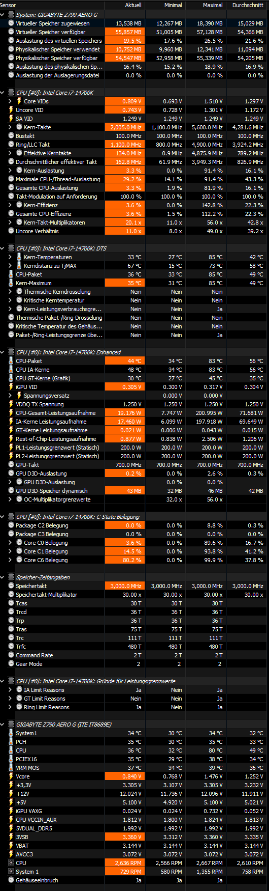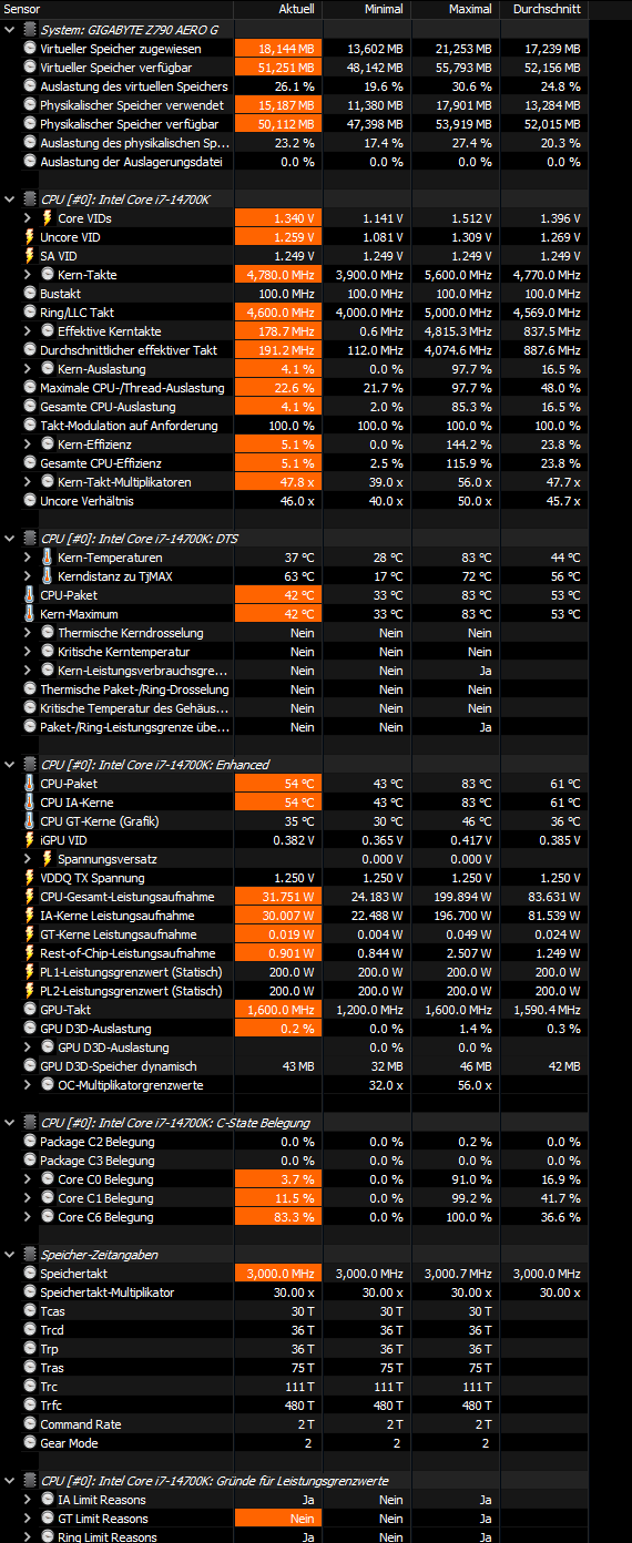 Setup: i7-14700K auf 200 W limitiert, Z790 Aero G, aktuelles BIOS F15.