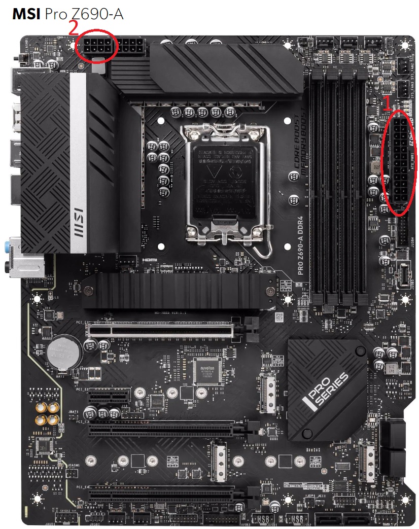Ich habe am Mainboard sowohl das Standardstromkabel (1) und ein zusätzliches 8-Pin Stromkabel (2) angeschlossen. In dem Tutorial von damals wurde gesagt, dass die CPU den zusätzlichen Stromanschluss eigentlich nicht bräuchte, allerdings werde er es trotzdem anschließen (besser haben als brauchen).
