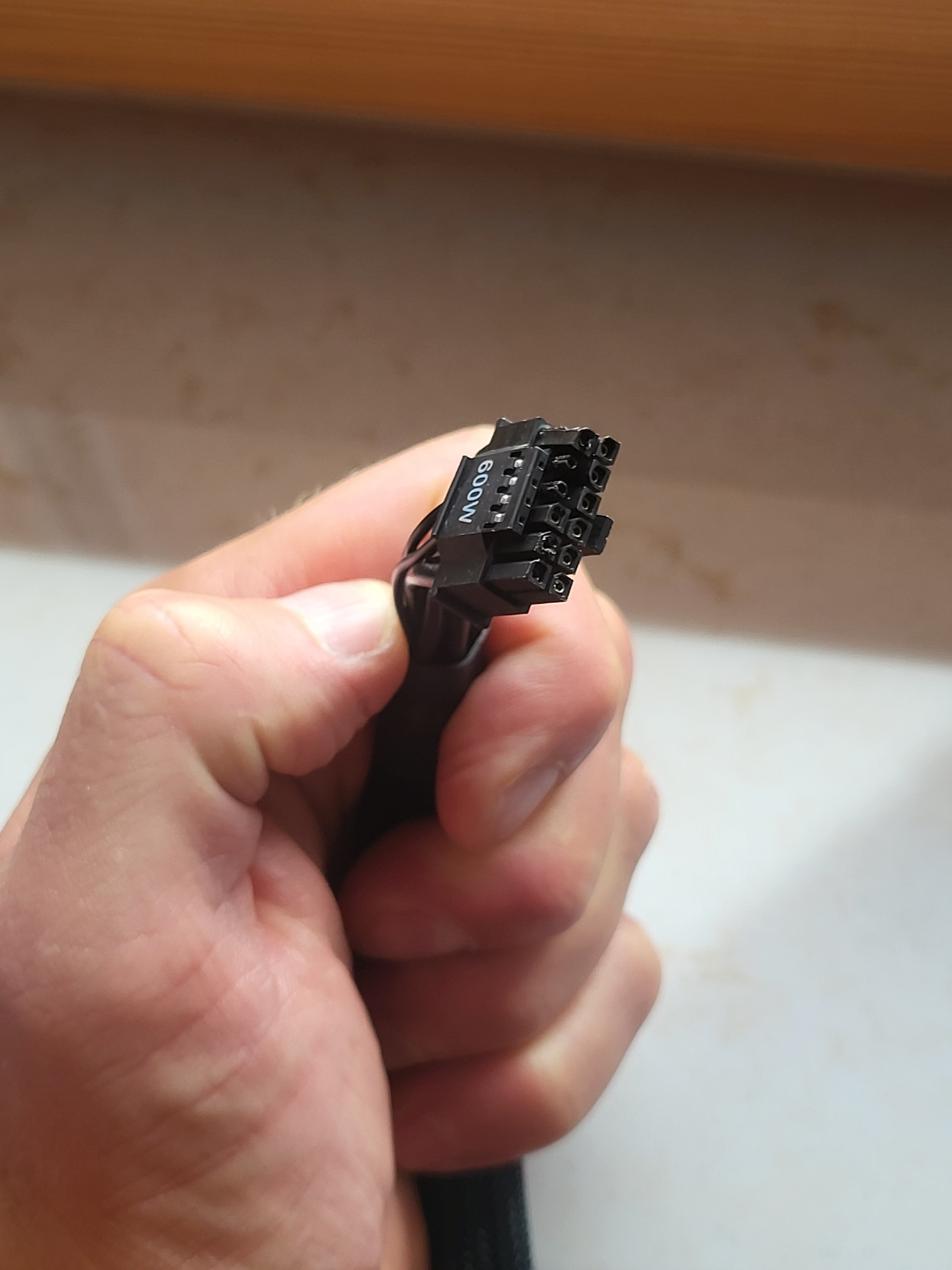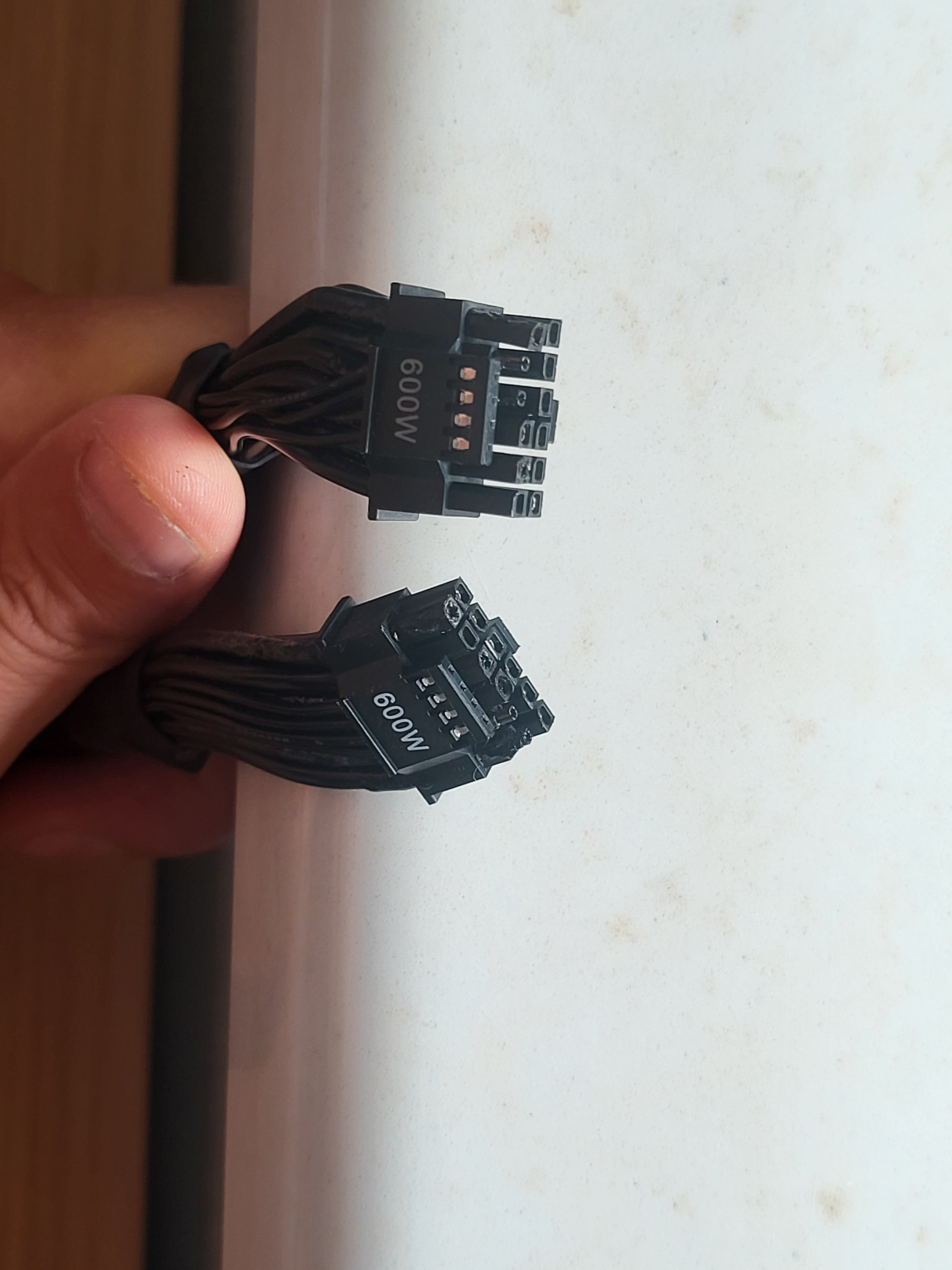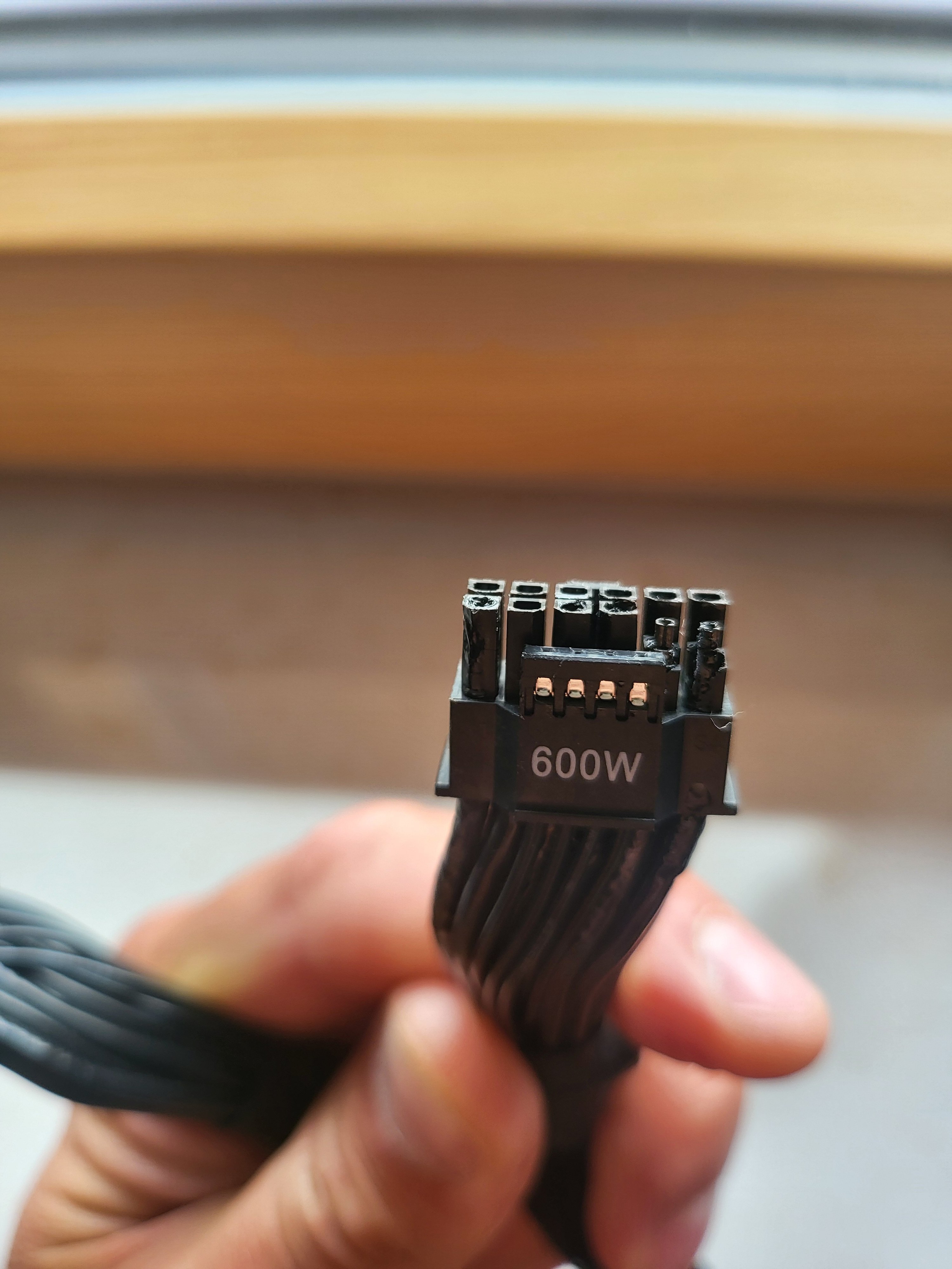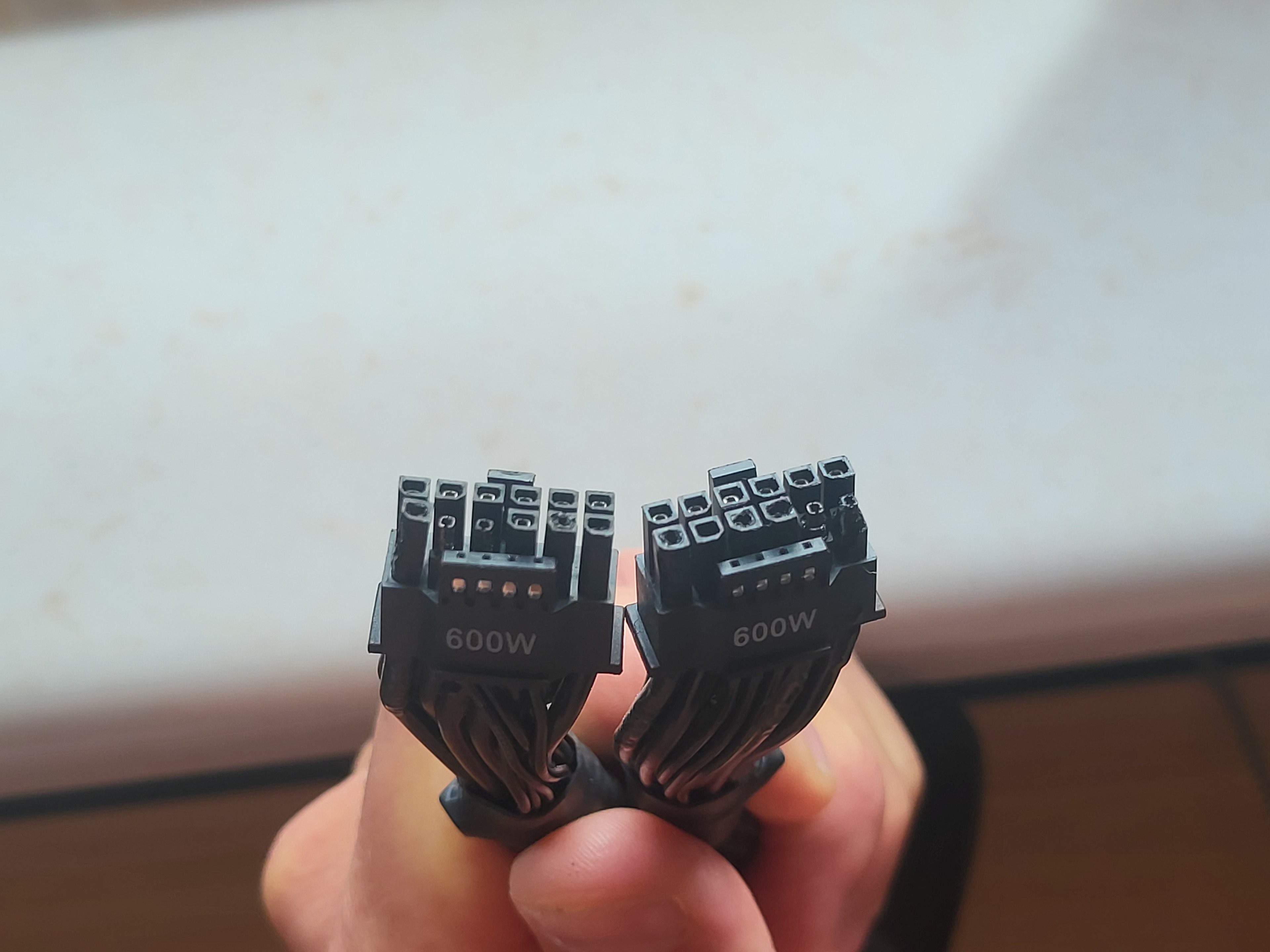 Der 600Watt Stecker der vom Netzteil zur Grafikkarte verläuft scheint etwas "verschmolzene" Pins zu haben (siehe Fotos).