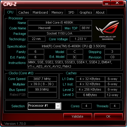 Im Leerlauf sieht alles normal aus, aber sobald Prime95 läuft, springt die Spannung (Vcore) gleich auf 1.233 Volt und bleibt so die ganze Zeit. Das alles mit läppischen 3.9 GHz und ganz ohne irgendwelche Fummelei im BIOS (alles auf Auto) eines genauso neuen ASUS Z97 Maximus VII Hero. Die Temperatur steigt natürlich fleißig mit.