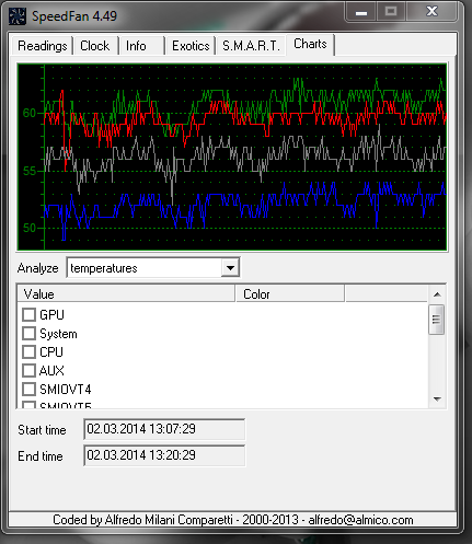 Denke mal, dass das ein Auslesefehler ist...ich lade mir sonst gleich mal AIDA runter und lass Prime95 15min oder so laufen. Temps sind auch immer mal wieder unterschiedlich, hatte auch schon eine Runde 70°C, lag aber vermutlich daran, dass die Graka davor mal ein paar Stunden im Benchmark verbracht hat und die Luft dementsprechend im Gehäuse relativ warm war. Sind halt low rpm Lüfter... EDIT1: