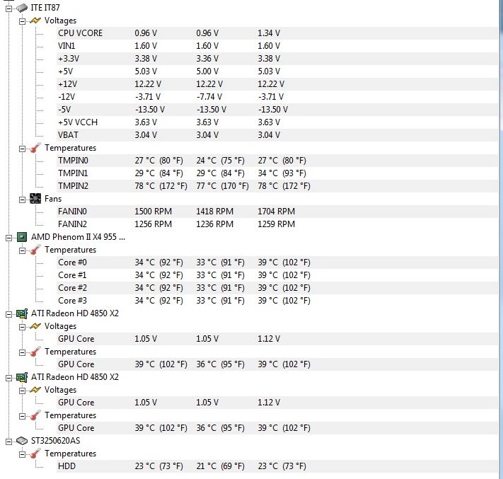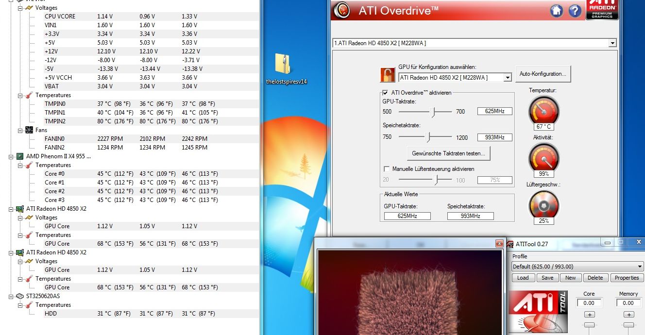 Die Temperatur der GPUs steigt dabei auf maximal 72 Grad bevor der Absturz auftritt. (mit HW Monitor und ATI Overdrive überprüft). RivaTuner sagt noch: "gpu shader core" wird bis 70° und Memory IO bis 75° heiß, bevor der Fehler auftritt, allerdings bin ich nicht sicher, ob die RivaTuner angaben korrekt sind.