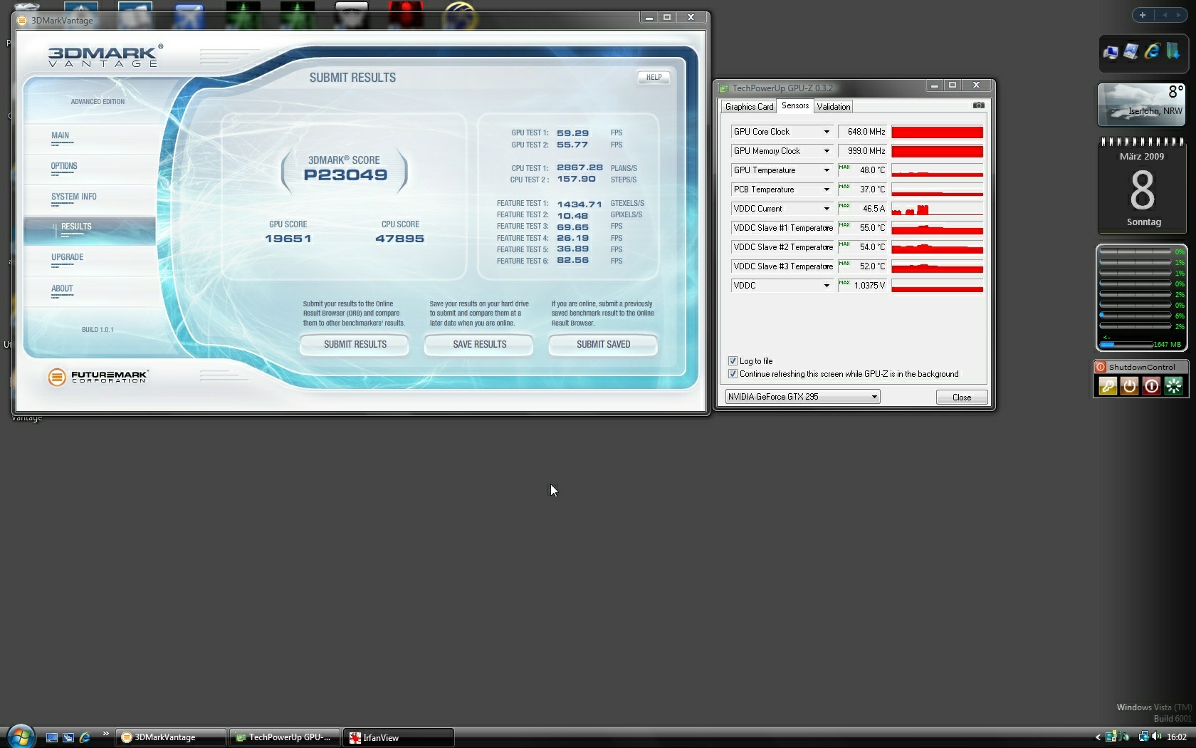 Die von GPUz angegebene Stromstärke von 46A dagegen bezieht sich auf eine ganz andere Spannung, auf die VDDC. Ich kenne die Spannungen einer GTX 295 nicht, aber das sollte zwischen 1V-1,5V sein.