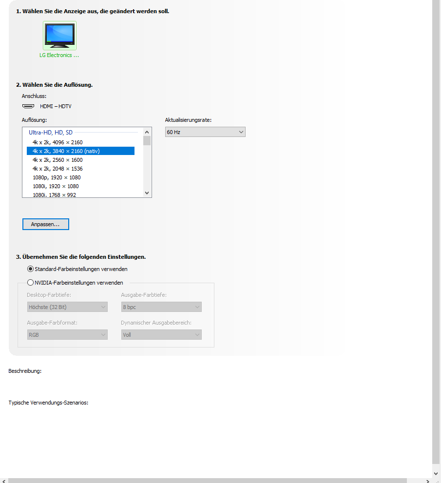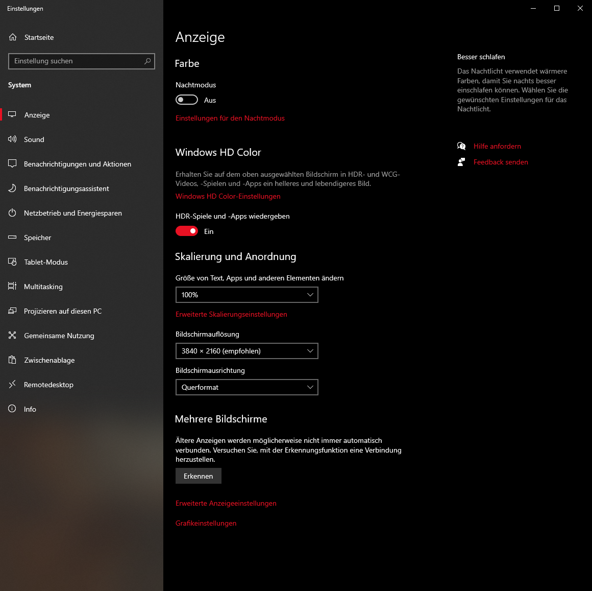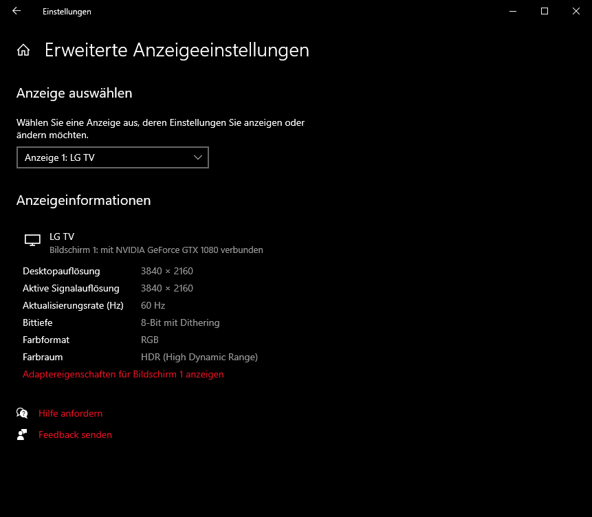 ich hab da eine eher ungewöhnliche Frage: Ich nutze schon seit 2015 nen 4K Fernseher als Monitor, und hab es damals irgendwie geschafft Dinge so einzustellen, dass ich 4K@60Hz ohne Chroma Subsampling (oder zumindest ohne sichtbare Artefakte) nutzen konnte und auch genutzt habe. Jetzt bin ich auf nen LG C9 gewechselt und hatte gleiches Spiel: Chroma Subsampling machte Texte recht hässlich (mit fuzzeligem gelben Rand), doch nach einigem Ausprobieren läuft mein Windows jetzt in 4K mit 60Hz + HDR über eine 1080, ohne dass es (scheinbar) zu Chroma Subsampling kommt (siehe Bild). Meine Frage ist jetzt: Warum funktioniert das überhaupt über HDMI 2.0? Ich dachte das wäre allein wegen der Bandbreite nicht möglich?