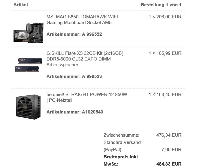Alles bis auf Mainboard, RAM, CPU Kühler und Netzteil ist bereits geliefert worden, soll ich diese Komponenten einfach bei NBB neu bestellen oder seht ihr hier noch kurzfristig bessere Alternativen für die oben genannten 4 Komponenten?