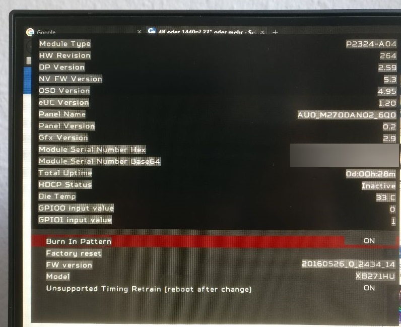 Was bisher glaube ich noch nie einer irgendwo erwähnt hat: Wenn man den Monitor nur mit 120 Hz betreibt, lässt er sich auch auf 10 Bit stellen, zumindest bei mir in der NVIDIA-Systemsteuerung. Wie das funktioniert, obwohl das Panel laut Hersteller nur mit 8 Bit ausgewiesen wird, weiß ich nicht, allerdings sehe ich spontan bei meinem 10-Bit-Demo-Material keinen Unterschied.