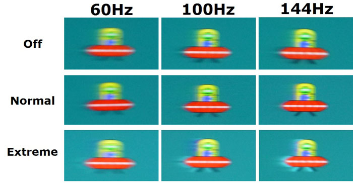 Normal: Absolut identisches Verhalten zur Off Einstellungen im normalen Modus. Overdrive funktiniert im FreeSync Modus schlicht NICHT. Es sind üble Schlieren deutlich zu erkennen. Acer lügt sich ins Fäustchen, wenn sie schreiben, dass FreeSync und Overdrive aufeinander abgestimmt sind.