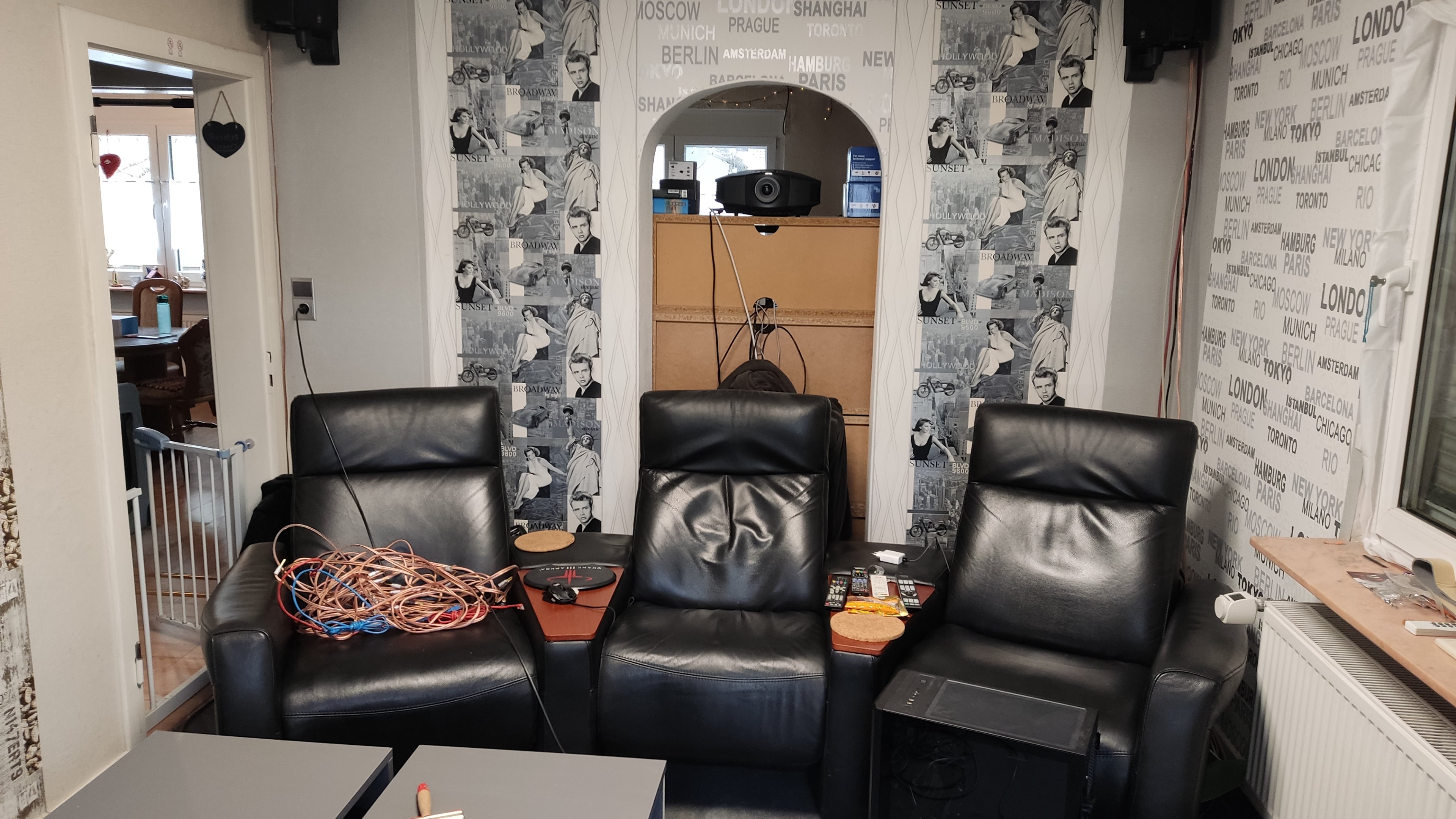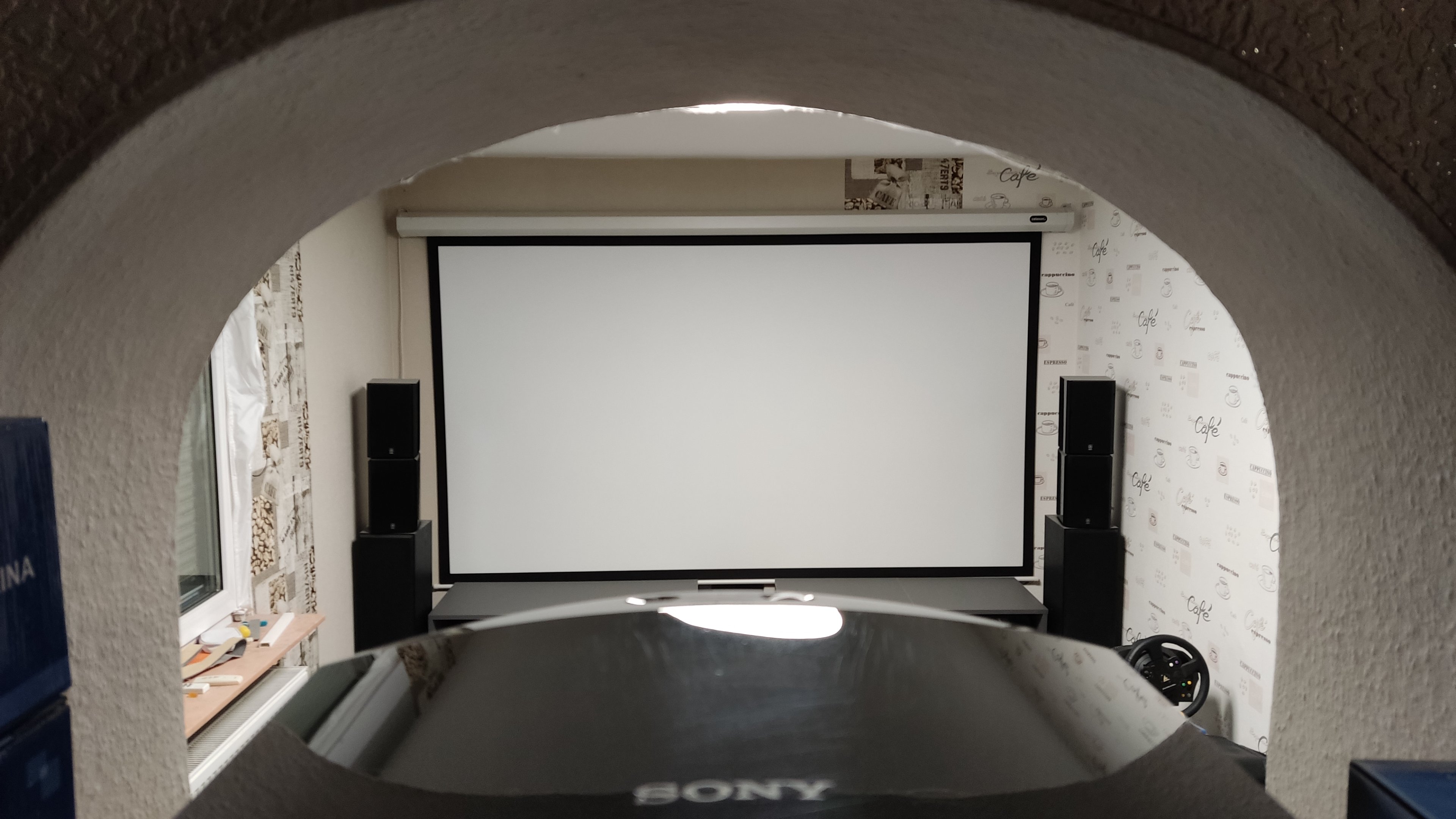 Tatsächlich löse ich damit meine über die vielen Jahre liebgewonnene Filmprojektion ab. Über einen Panasonic PT-AE700 (noch 720p) über eine Regenbogenmaschine (BenQ W1070, RGB-Farbrad) bis hin zum sehr hochwertigen Sony 3-Chip SXRD-Projektor VPL-HW45ES habe ich vieles mitgemacht - stets über eine ca. 2,7 Meter breite (122" Diagonale) Economy-Leinwand von Celexon.