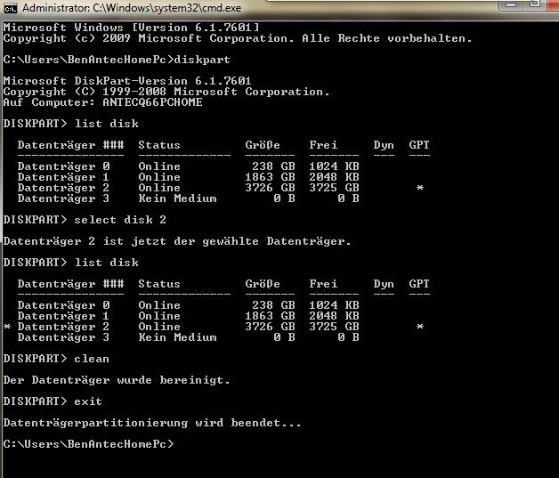 Ich denke das bekomm ich hin und wenn ich dann in der list disk die ganze 4Tb sehe bekomm ich die Fehlerhafte GPT Datei auch gelöscht. Wenn ich damit nichts erreiche mach ich mir wohl ne CD mit Gparted und versuche damit mein Glück...