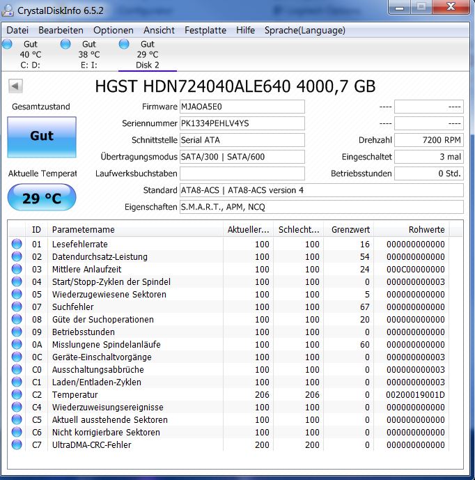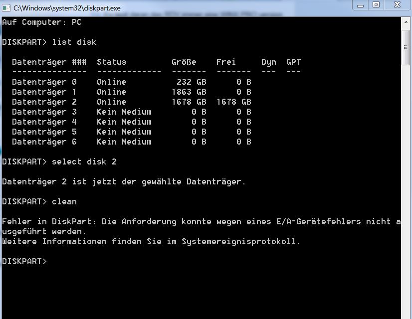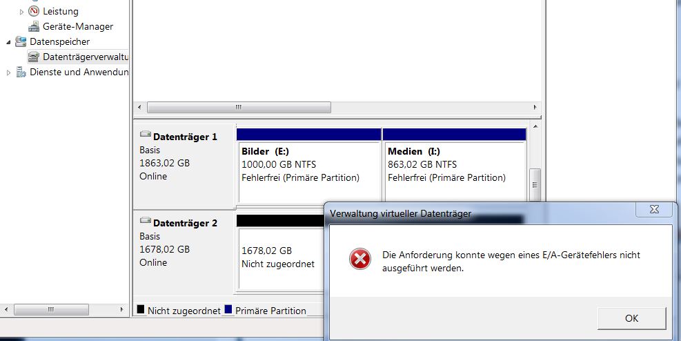 Habe mir für meinen Wohnzimmer-PC eine 4TB HDD von HGST gekauft. Leider werden unter Windows 7 64bit Prof nur 1,67GB angezeigt. In der Datenträgerverwaltung habe ich versucht, auf GPT umzustellen. Dann kommt jedoch die Meldung "Die Anforderung konnte wegen eines E/A-Fehlers nicht augeführt werden". Auch über Diskpart geht es nicht. Unter crystalDisk wird die Festplatte zumindest korrekt als 4TB angezeigt. Bei HD Tune sinds 1,8GB, wie auch im BIOS.
