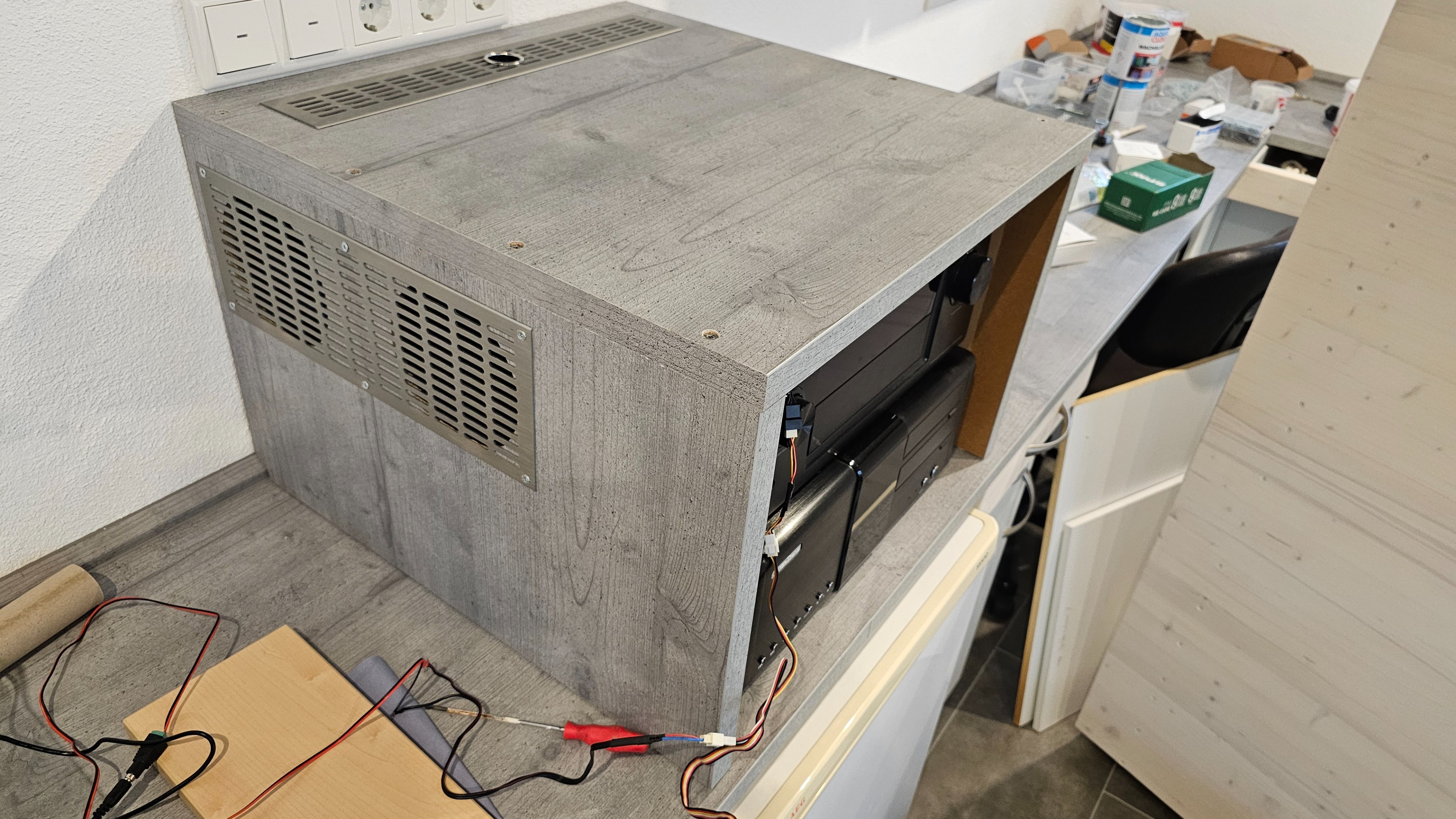 Auf einem halbwegs sparsamen Rechner (12500) im Desktop-Gehäuse steht ein Denon AVR (x4300H), der schon spürbar warm wird. Ein Gestell in umgedrehter U-Form wird darüber stehen, also links und rechts neben den Geräten jeweils eine Stütze und oben darauf ein Brett. Seitlich sowie nach oben Platz sind je 5cm. Das Gestell besteht aus 28mm Arbeitsplatten und ist nach hinten sowie seitlich (Aussparungen) leicht und nach vorn ganz offen. Um die darunter angestaute warme Luft abzutransportieren dachte ich an 4 Lüfter, die unter dem Gestell hinter den Geräten positioniert sind und nach vorne blasen. Rein technisch sollte das funktionieren, einen Halter/Rahmen für die Lüfter zu bauen ist auch kein Problem.
