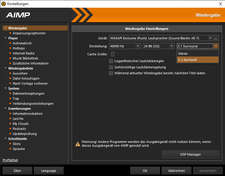 In AIMP kommt der Sound nur aus dem Center-Speaker.