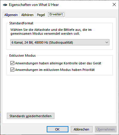 Ist so und funktioniert fast immer einwandfrei. Nur kann man die Lautstärke dann nicht mehr über "Lautsprecher" steuern sondern muss den Aufnahmekanal "Was Sie hören" anpassen. Dafür kann man die Anwendung "Volume²" von Alexandr Irza (