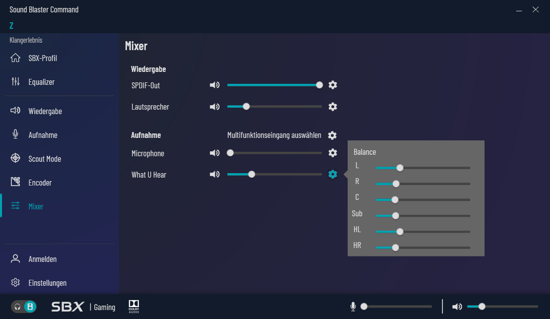 -> Den Punkt SBX-Profil anschauen. Über "Surround" lässt sich die intensivität einstellen. Habe bei meinem Logitech System auf 57% Surround und 30% Crystalizer gestellt. Letzteres verbessert bei mir die Dynamik mit mittleren Bereich etwas.