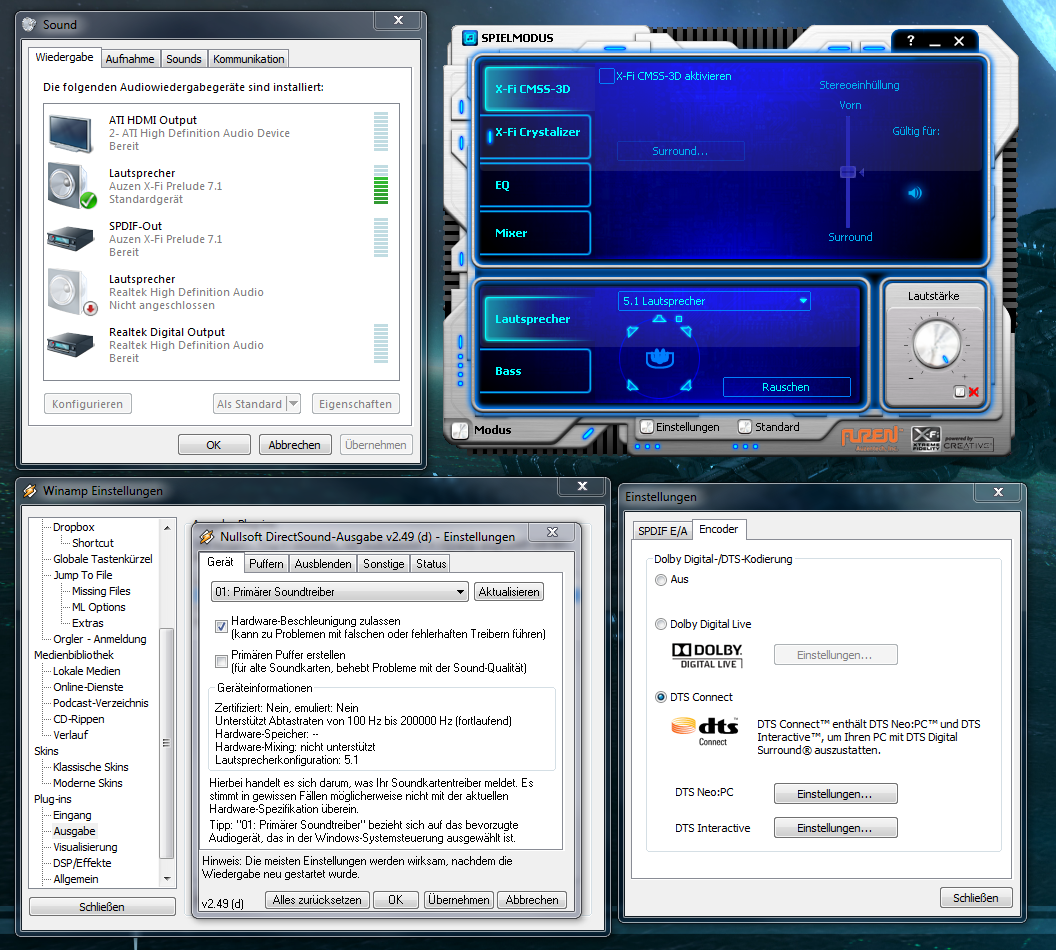 deßhalb habe ich ddl aktiviert. der avr erkennt am display "dolby digital", die windowssounds und der 5.1 kanaltest von creative funktionieren einwandfrei, aber sonst (über itunes und über cod4) wird leider nichts wiedergegeben.