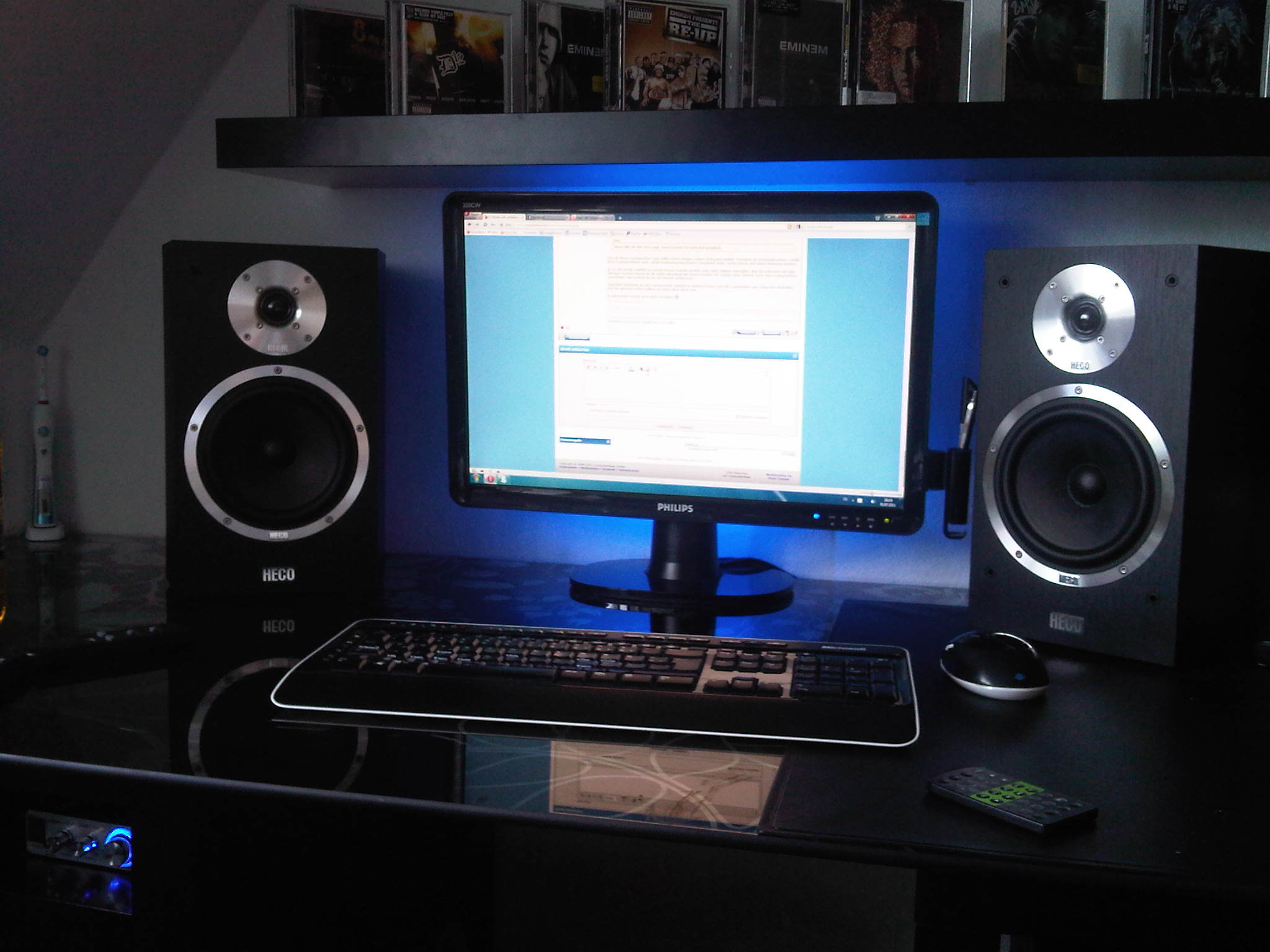 ich habe mir aus einer Laune heraus ein Set 5.1 Boxen von TEAC bestellt (Link), an die Soundkarte angeschlossen und provisorisch aufgestellt. Und so sieht das aus: