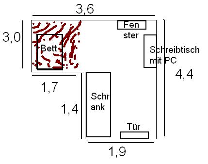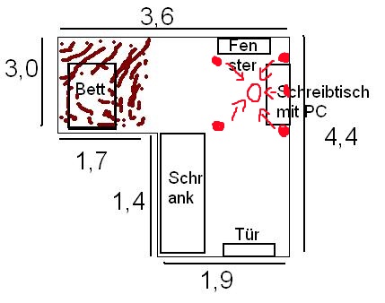 Hab mal ein Plan von meinem Zimmer angefügt. Das rote stellt die Dachschräge dar und die Angaben sind in Meter.