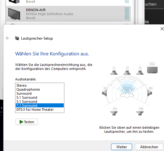 Wenn der Laptop mittels USB-C mit dem "Concept 8" verbunden ist wird der Windows 5.1 Soundtest, der Frauenhofer-ISE Test (https://www2.iis.fraunhofer.de/AAC/multichannel.html) und ein Testfilm in der Windows Dolby Access App jedoch richtig mit 5.1 abgespielt. Das heißt das Teufel Soundsystem ist schon einmal richtig verkabelt.