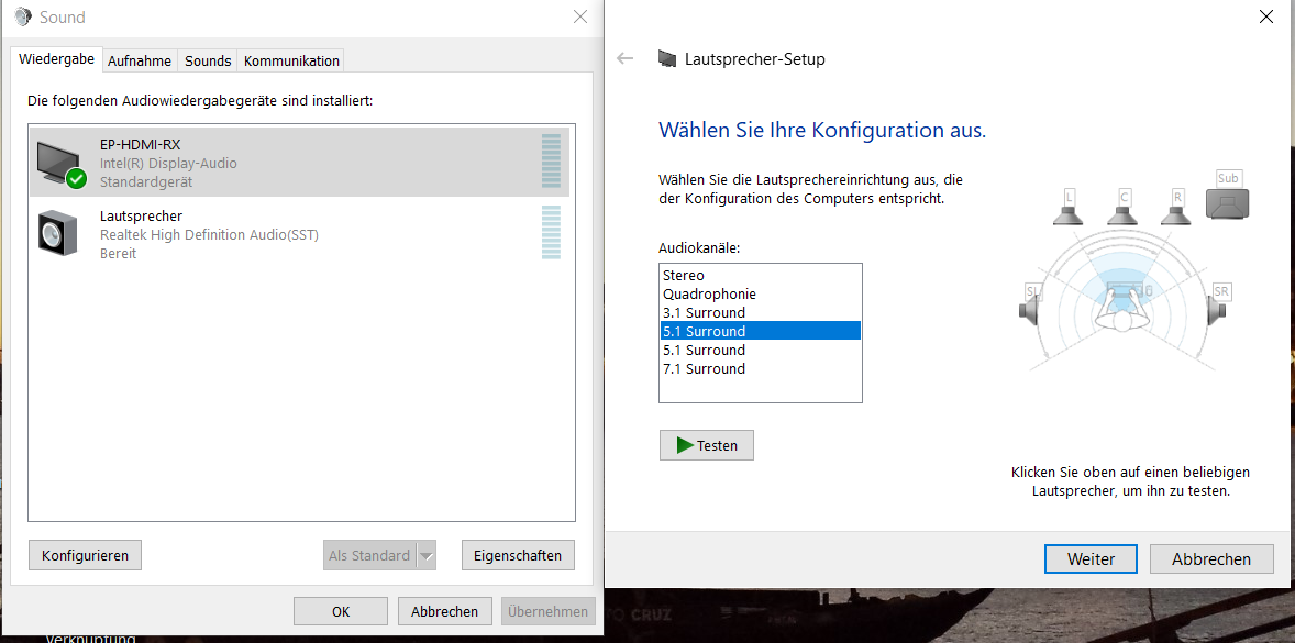 Mein Laptop (Acer Swift SF315-52) scheint nur eine "onboard"-Soundkarte zu haben, die vermutlich für 5.1 nicht ausreicht.