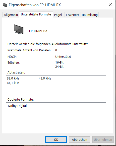Die externen Soundkarten die ich gefunden habe, haben keinen HDMI-Ausgang. Deshalb frage ich mich, ob die dann überhaupt das Dolby Digital Plus Signal übertragen könnten.