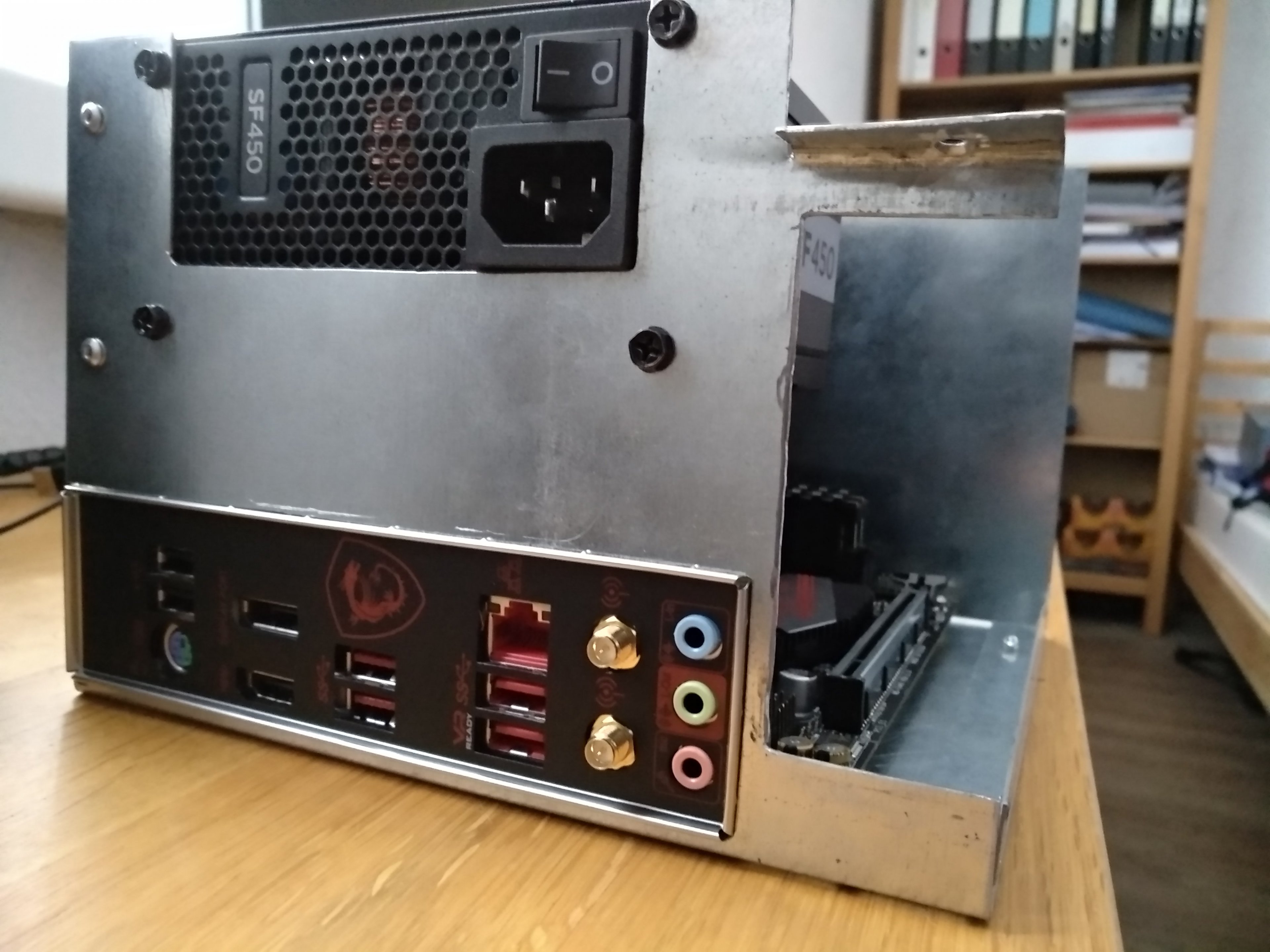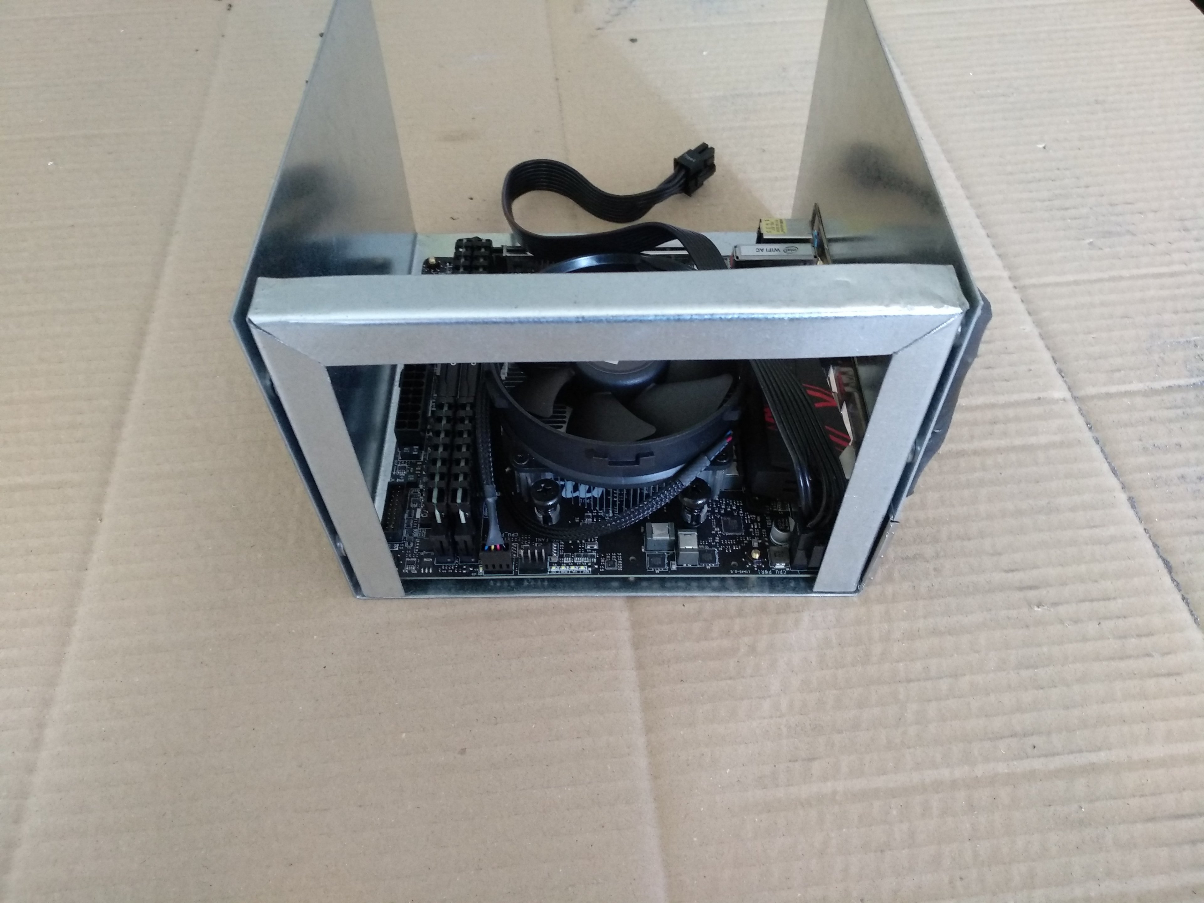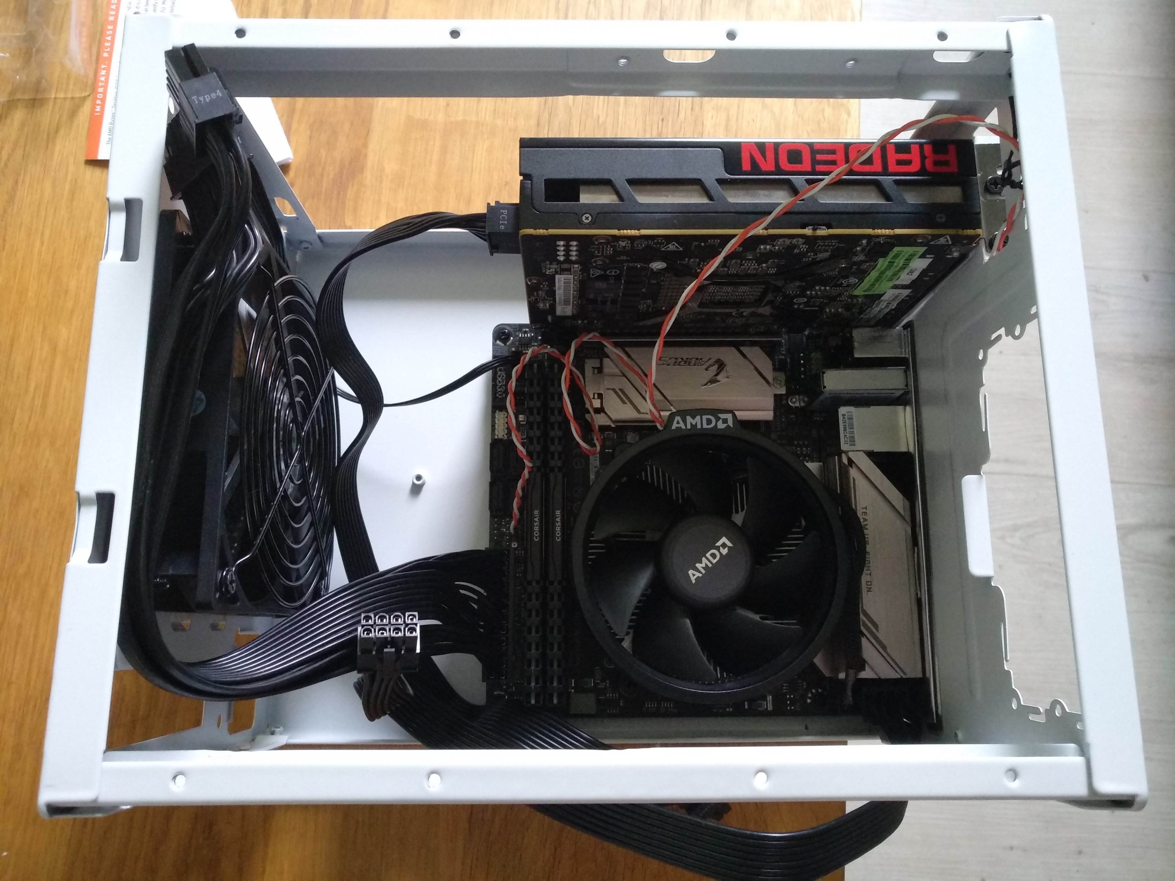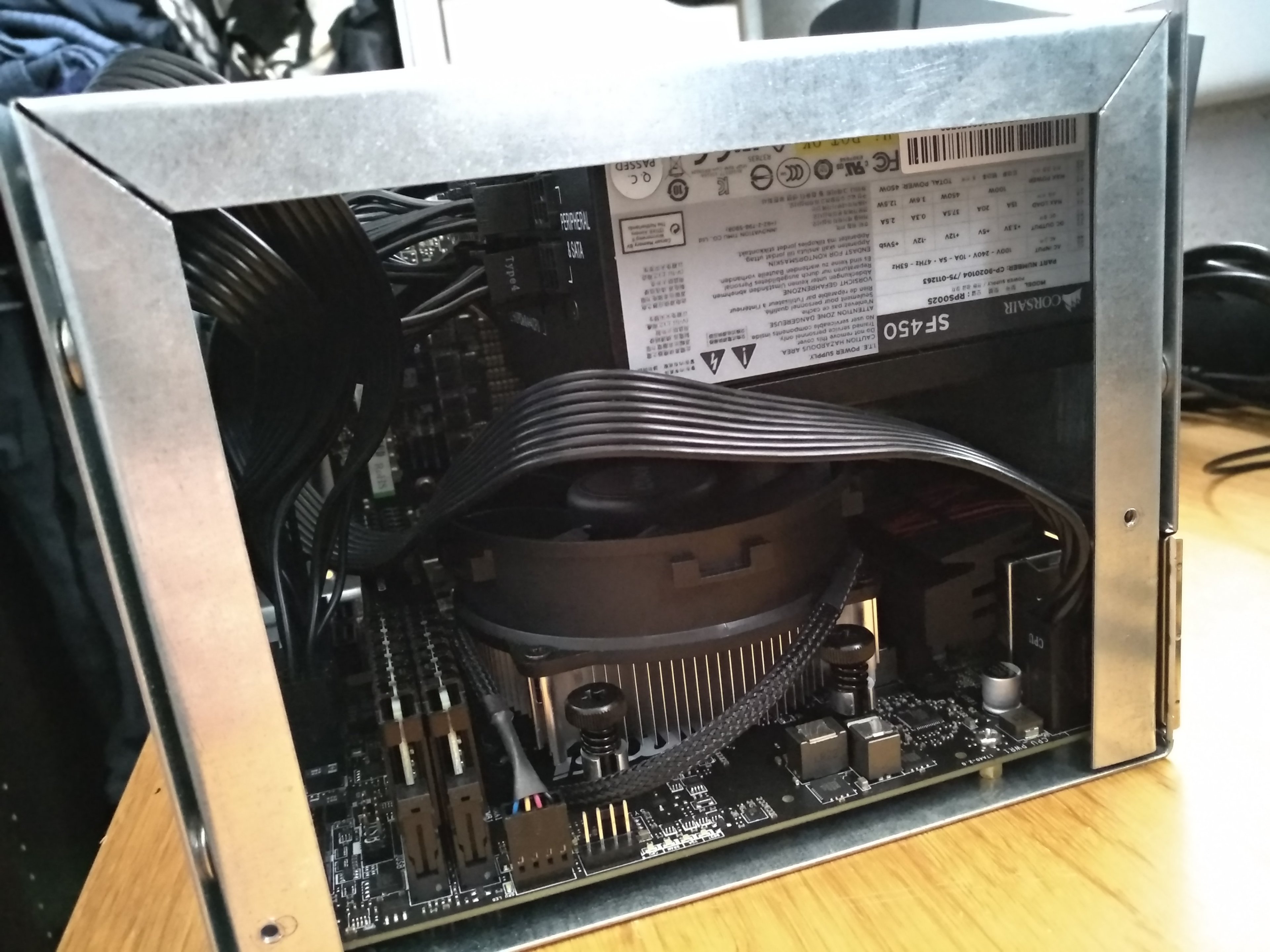 Alles kam in ein eigentlich gut belüftetes Silverstone SG05, weil ich mich erstmal vertaut machen wollte mit dem R5 3600 und seinem mitgelieferten Kühler. Im Spielbetrieb wurde das ganze dann überraschend laut. Und auch ohne Last wurde der Lüfter ständig geregelt, was nervte. Also im BIOS die Lüfterkurve angepasst: 20% (~950rpm) bis 70°C und dann auf 100°C/100%.