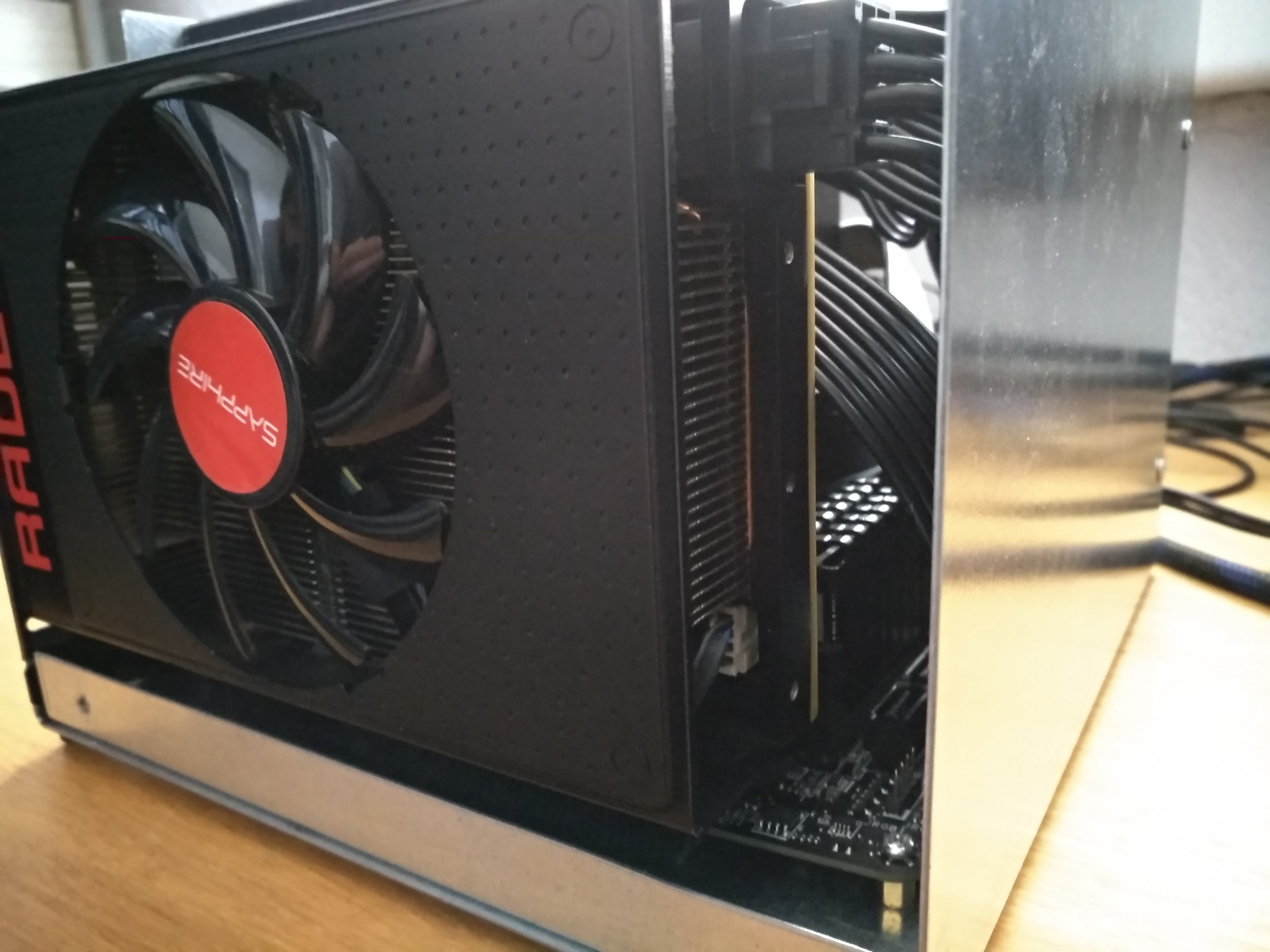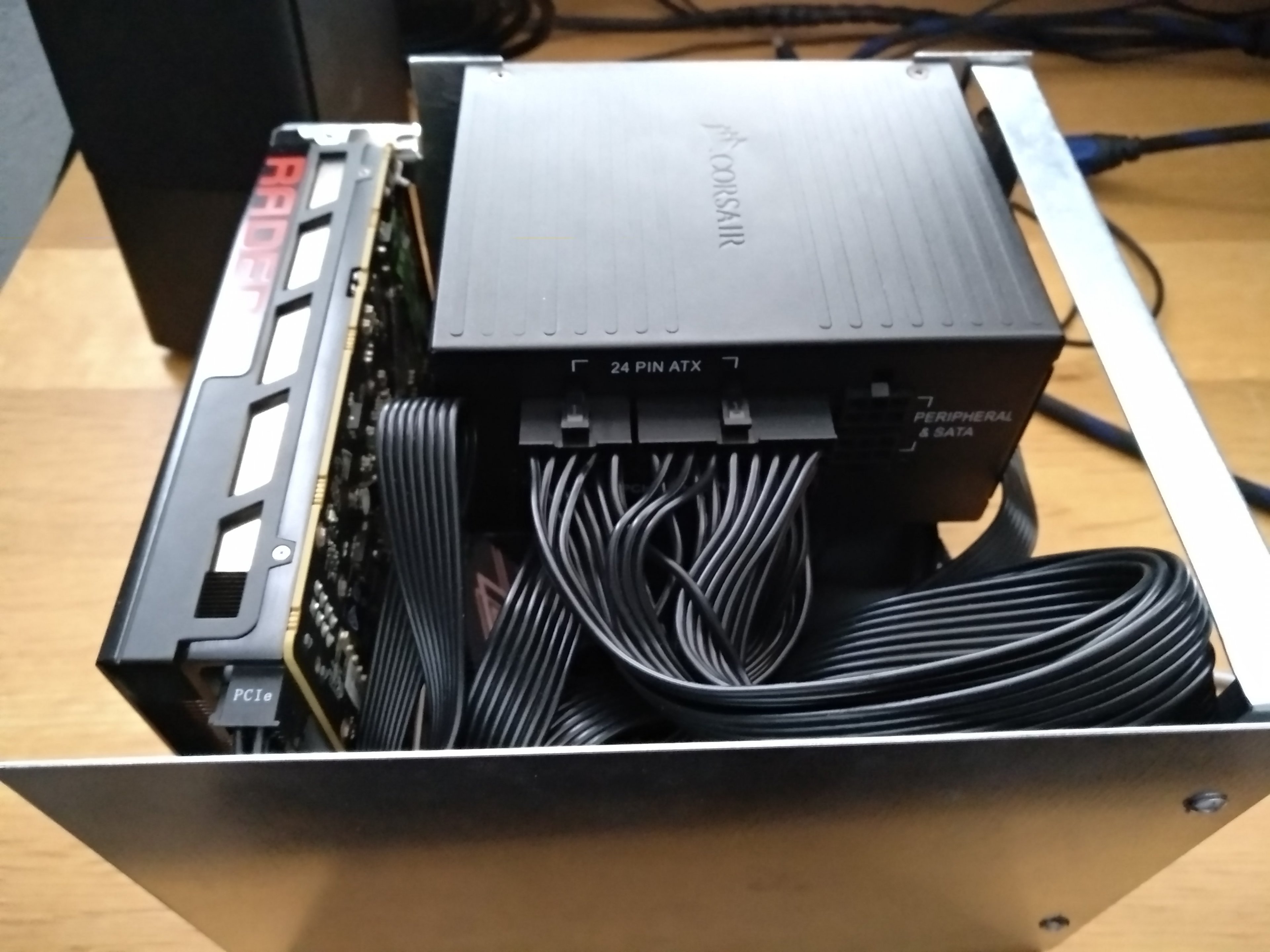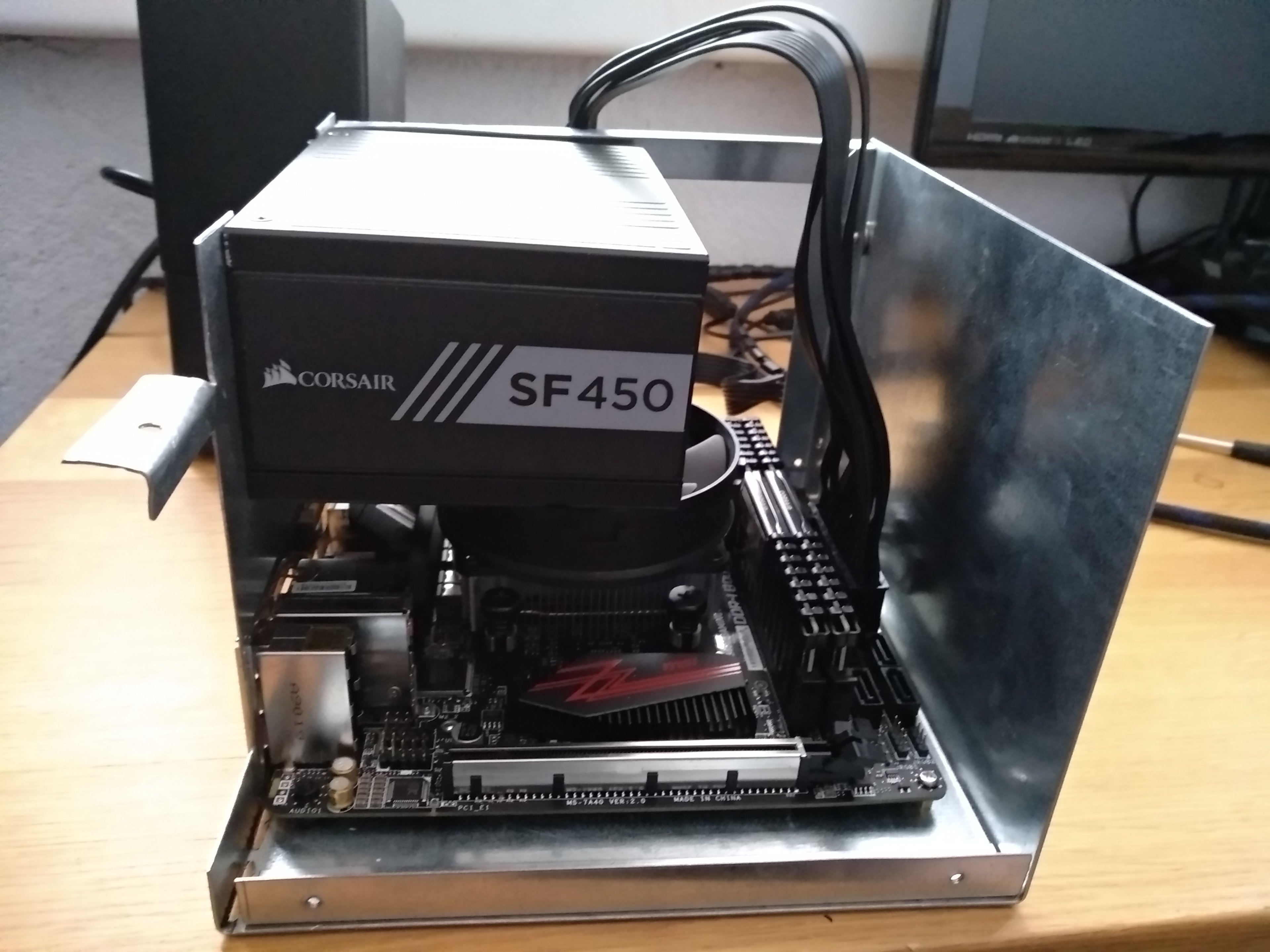 Alles kam in ein eigentlich gut belüftetes Silverstone SG05, weil ich mich erstmal vertaut machen wollte mit dem R5 3600 und seinem mitgelieferten Kühler. Im Spielbetrieb wurde das ganze dann überraschend laut. Und auch ohne Last wurde der Lüfter ständig geregelt, was nervte. Also im BIOS die Lüfterkurve angepasst: 20% (~950rpm) bis 70°C und dann auf 100°C/100%.