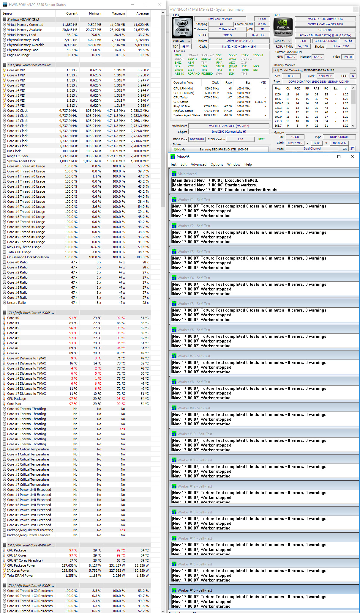 Mein Fazit: Alle Kerne bei 5 ghz ist soweit ich das absehen kann, beim 9900k unsinnig, da man auch mit einer High-End-Custom-Wasserkühlung niemals mit voller Prime-Last die Kerne unter 100° C CPU-Kerntemperaturen bleiben und dann die CPU sich sowieso relativ schnell selbst runtertaktet, sogar auf 4,5 ghz. Gut sind 100° C für die CPU auf Dauer auch nicht.