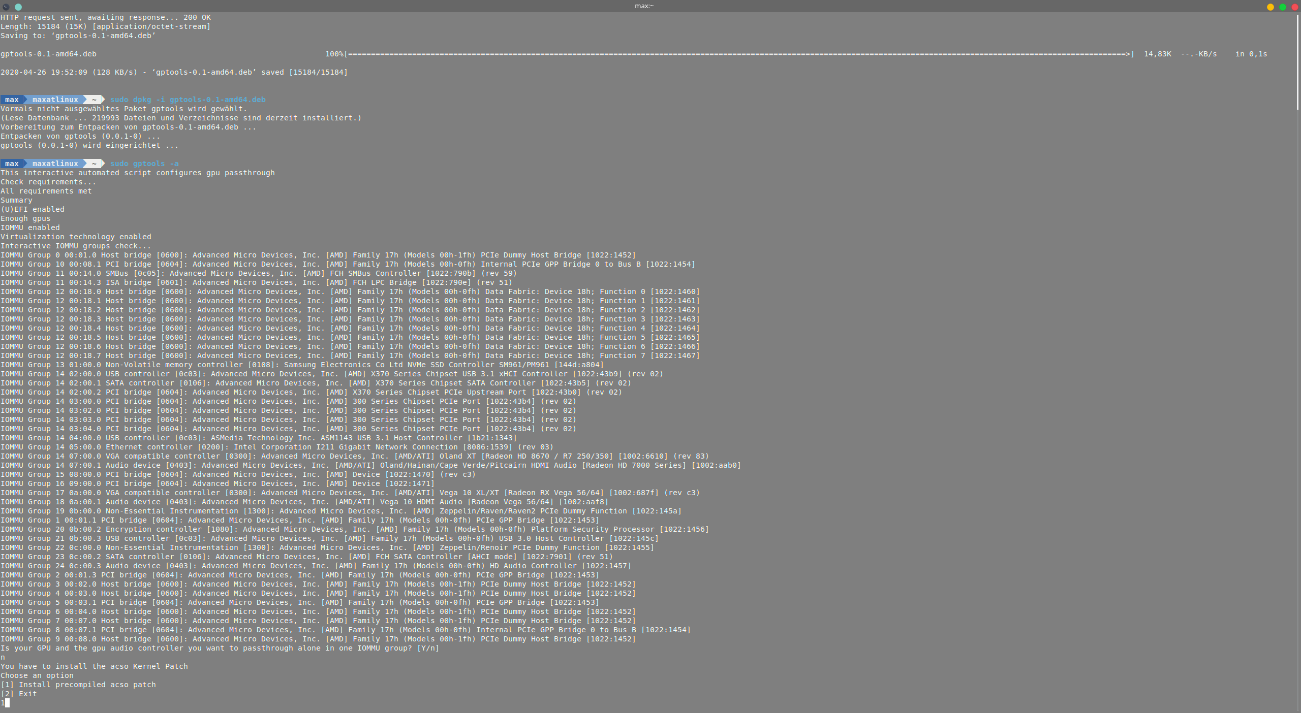 Falls das Programm erkennt, das sich noch andere Geräte in der GPU IOMMU Gruppe befinden, erscheint automatisch ein Dialog zur Installation eines Kernels mit acso Patch.