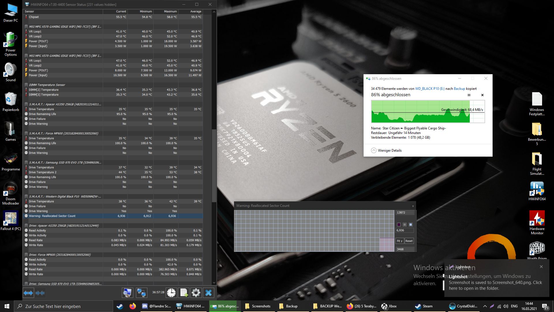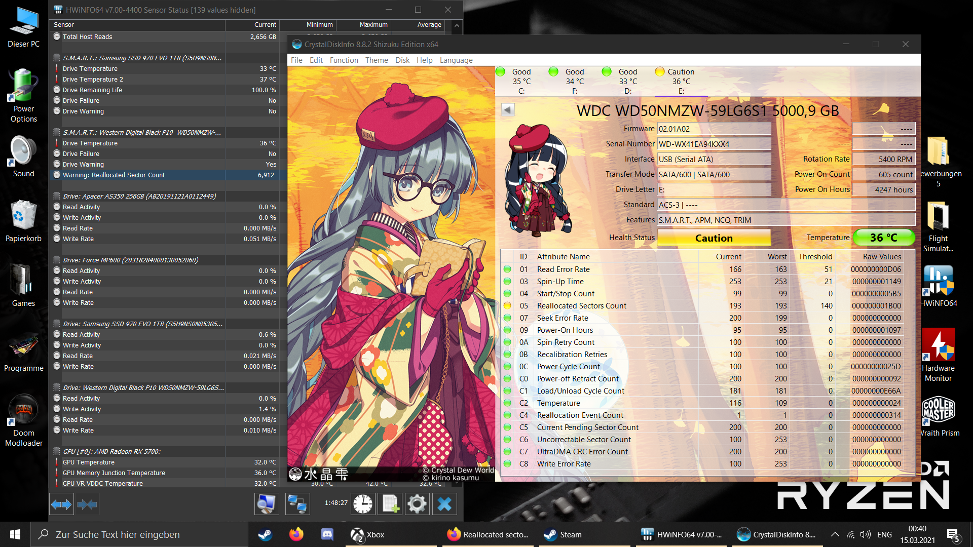 Beim Studieren der technischen Daten des PCs nach Gesamtstromverbrauch und ordnungsgemässer Funktion nach Undervolting und höchsten Stromspareinstellungen nach dem Umbau auf den neuen Zen 2 Ryzen Prozessor, ist mir eine Warnmeldung für eine der Festplatten aufgefallen.