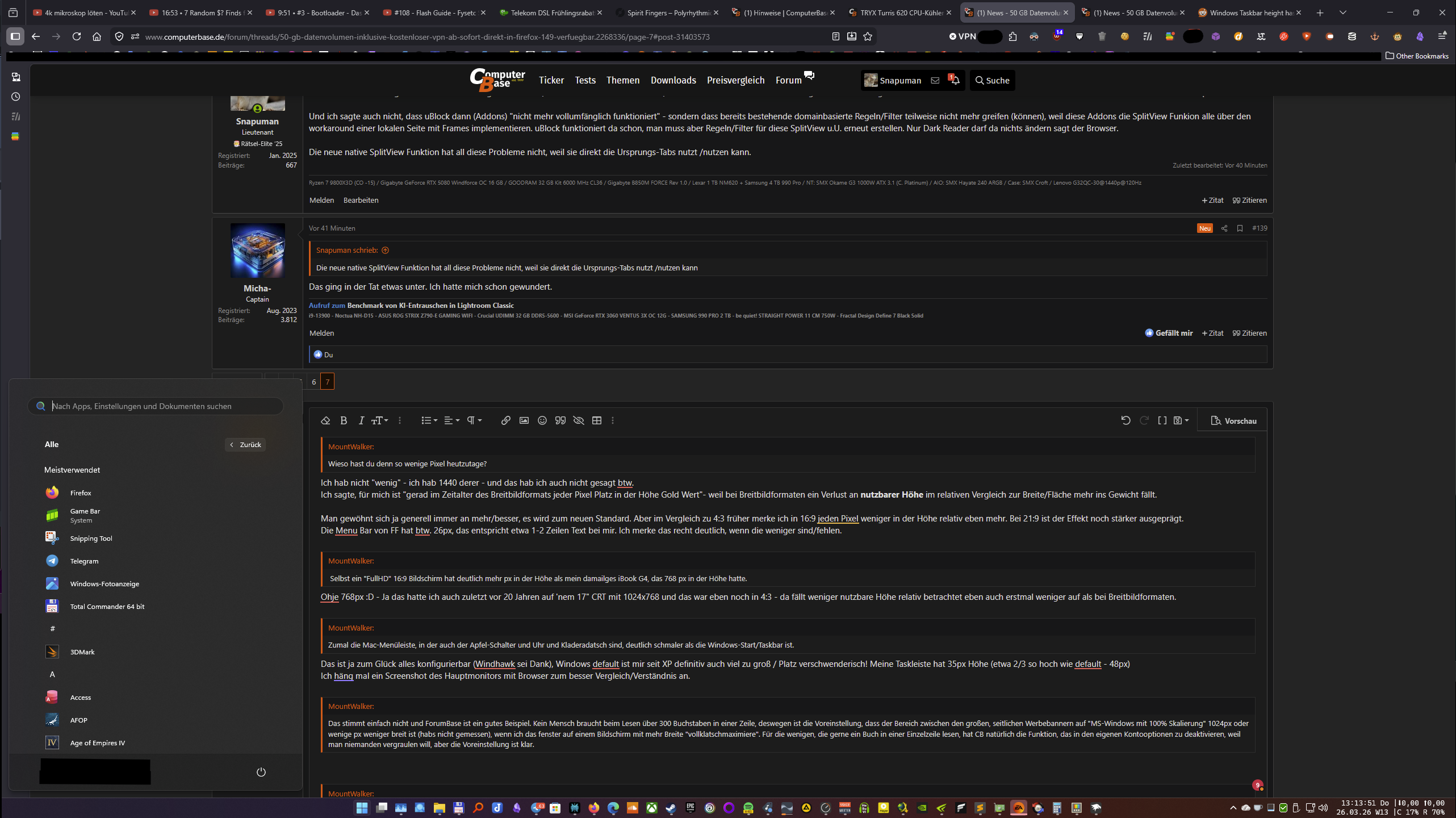 Das ist ja zum Glück alles konfigurierbar (Windhawk sei Dank), Windows default ist mir seit XP definitiv auch viel zu groß / Platz verschwenderisch! Meine Taskleiste hat 36px Höhe (etwa 2/3 so hoch wie default - 48px)