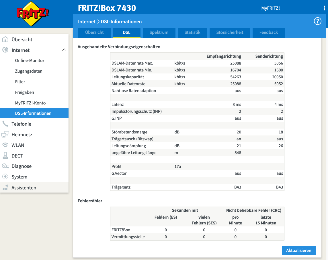 laut Messgerät vom Techniker, der Ende März meinen Anschluss geschalten hat, hätte ich eine "Leitungskapazität" von 55.xxx kbit/s. Er meinte, dass man da durchaus mal 50/10 Mbit/s schalten könne. Die würden zwar nicht voll ankommen, aber da es mir vor allem auf den Upload ankommt, wäre der wesentlich besser als 25/5 Mbit/s.