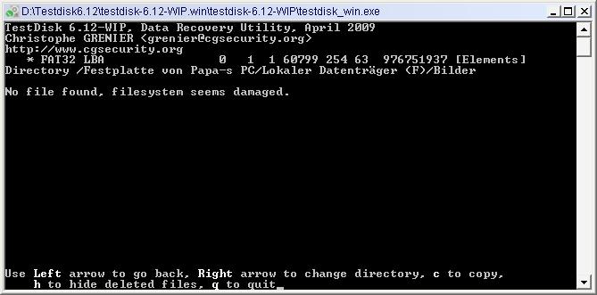 Die Analyse mit Testdisk zeigt eine intakte Partition (grün), die Verzeichnisstruktur kann man erkennen, nur der Inhalt wird als rot gekennzeichnete *.tmp dateien dargestellt. Diese Dateien haben ziemlich alle die selbe Grösse (ca. 32MB) und haben von der Anzahl und der Grösse her, nichts mit dem ursprünglichen Inhalt der Ordner zu tun.