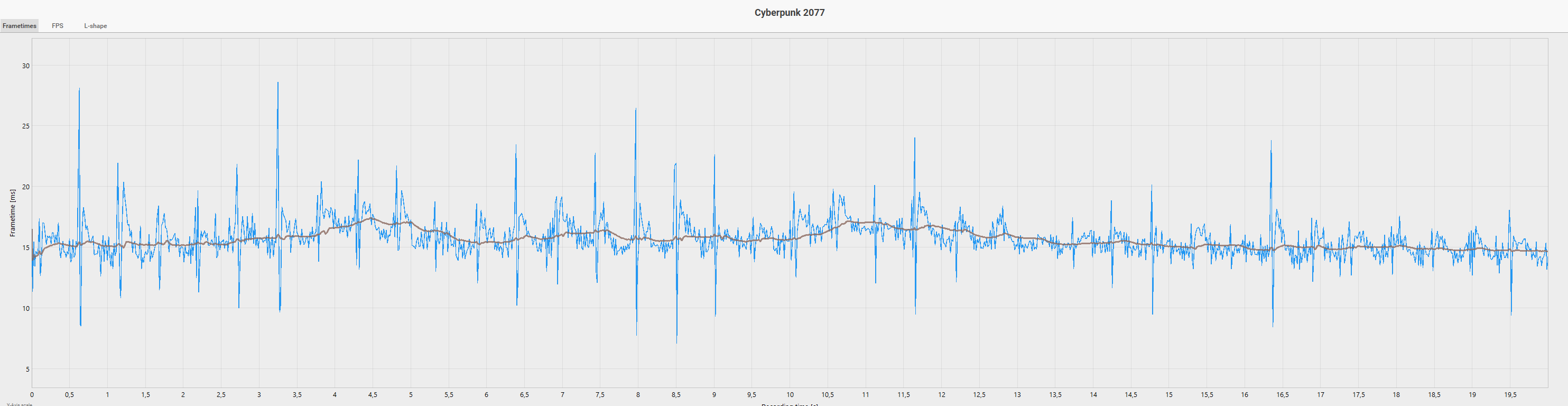 Habe nur Windows, normale Treiber (Intel Chipset, Nvidia Treiber, ...) installiert, Steam und Cyberpunk. Habe keinerlei Frame-Capturing-Software installiert und das Micro Stuttering war weiterhin sichtbar da. Jetzt also nochmal CapFrameX und natürlich alles Sensor Logging aus und so wie anbei sieht es aus...