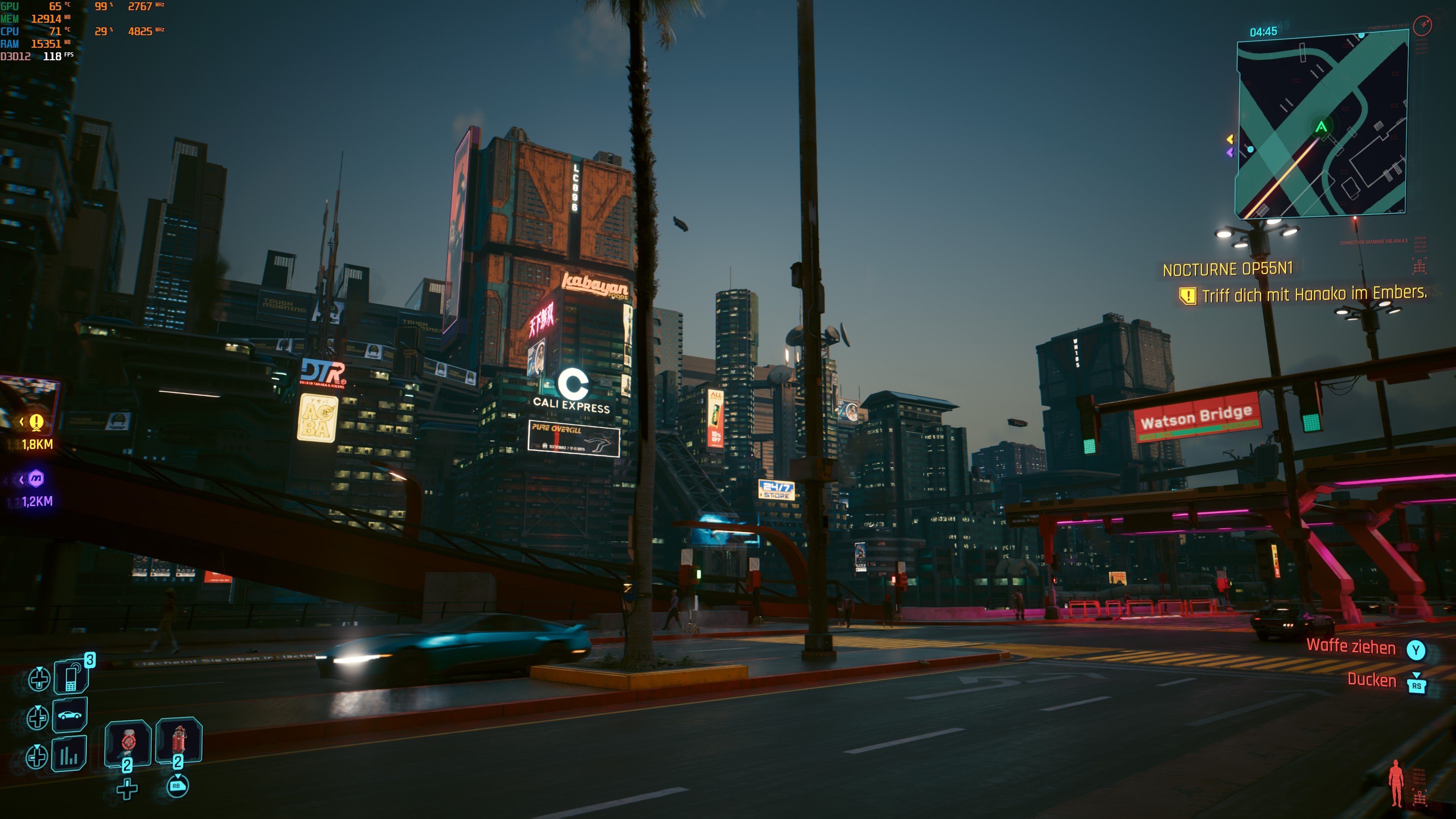 Cyberpunk : --Bild : 3840--2160 --Grafik einstellungen : alles auf ultra-hoch -- FPS 55 --GPU 99% CPU 32%