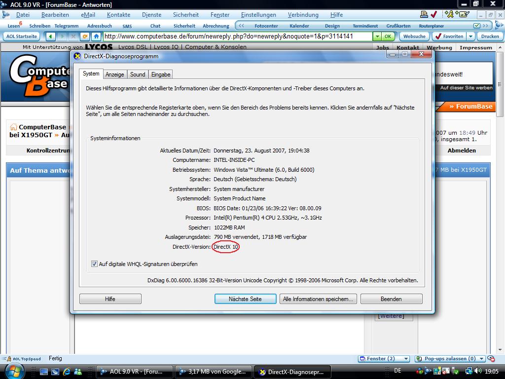 :freak: Öhm - wie DX8 oder niedriger? Das ist doch Vista? Müsste da nicht DX9 oder höher stehen ? Bist Du sich, das Du eine x1950gt hast oder ist das ein Witz? :lol: