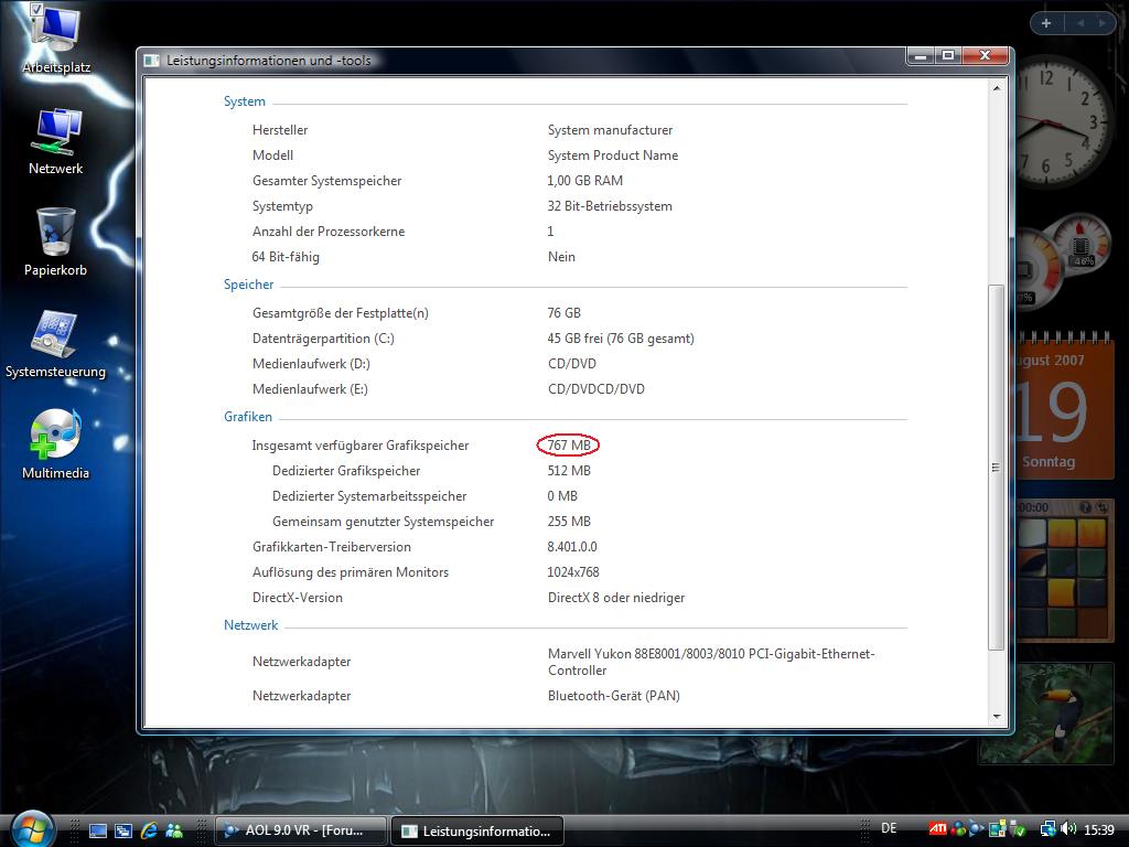 Die Grafikkarte hat 512MB RAM und nutzt noch zusätzlich 255MB vom Arbeitsspeicher.