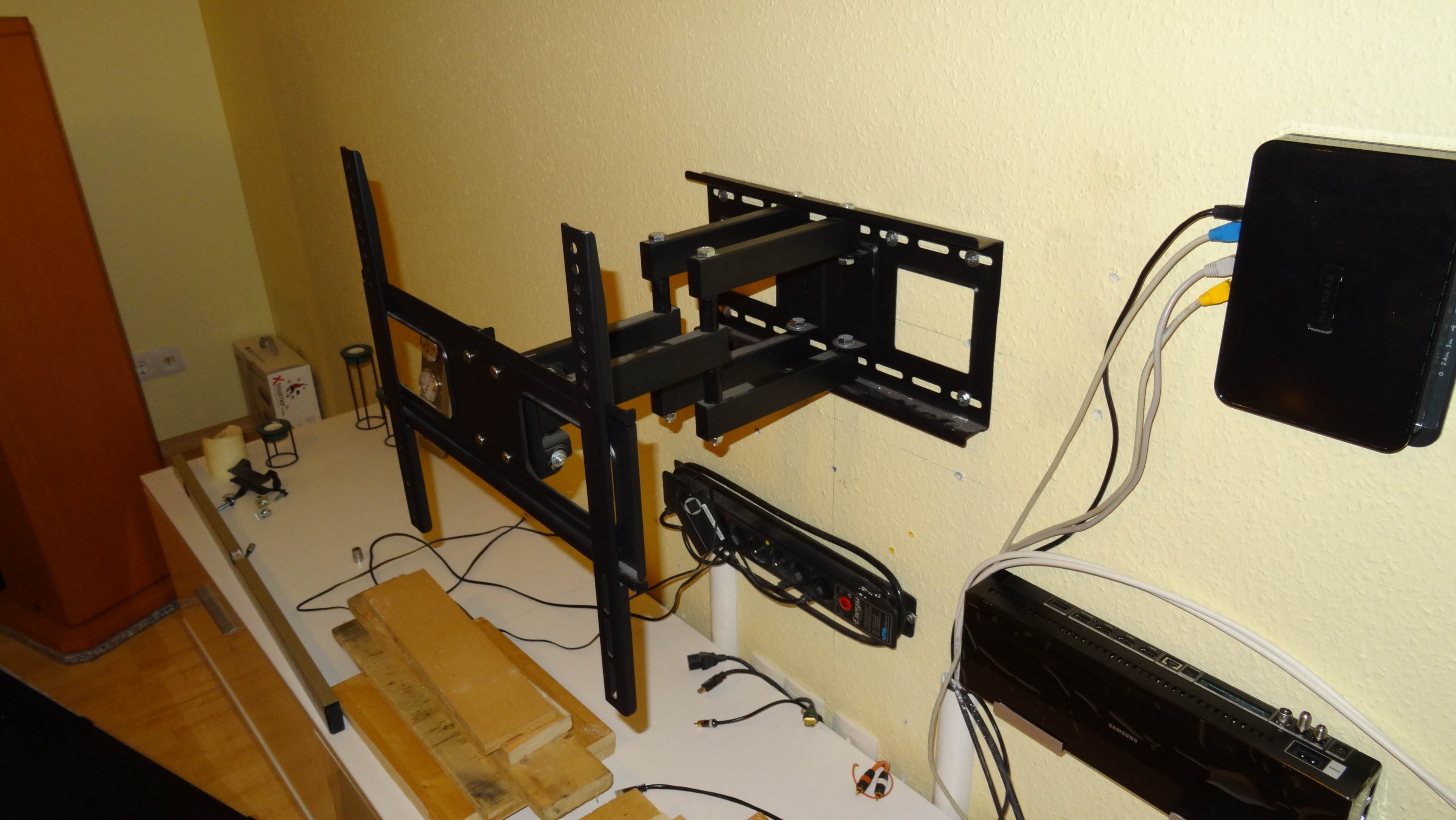 Und den Halter für den tv auf die Holzplatte schrauben.