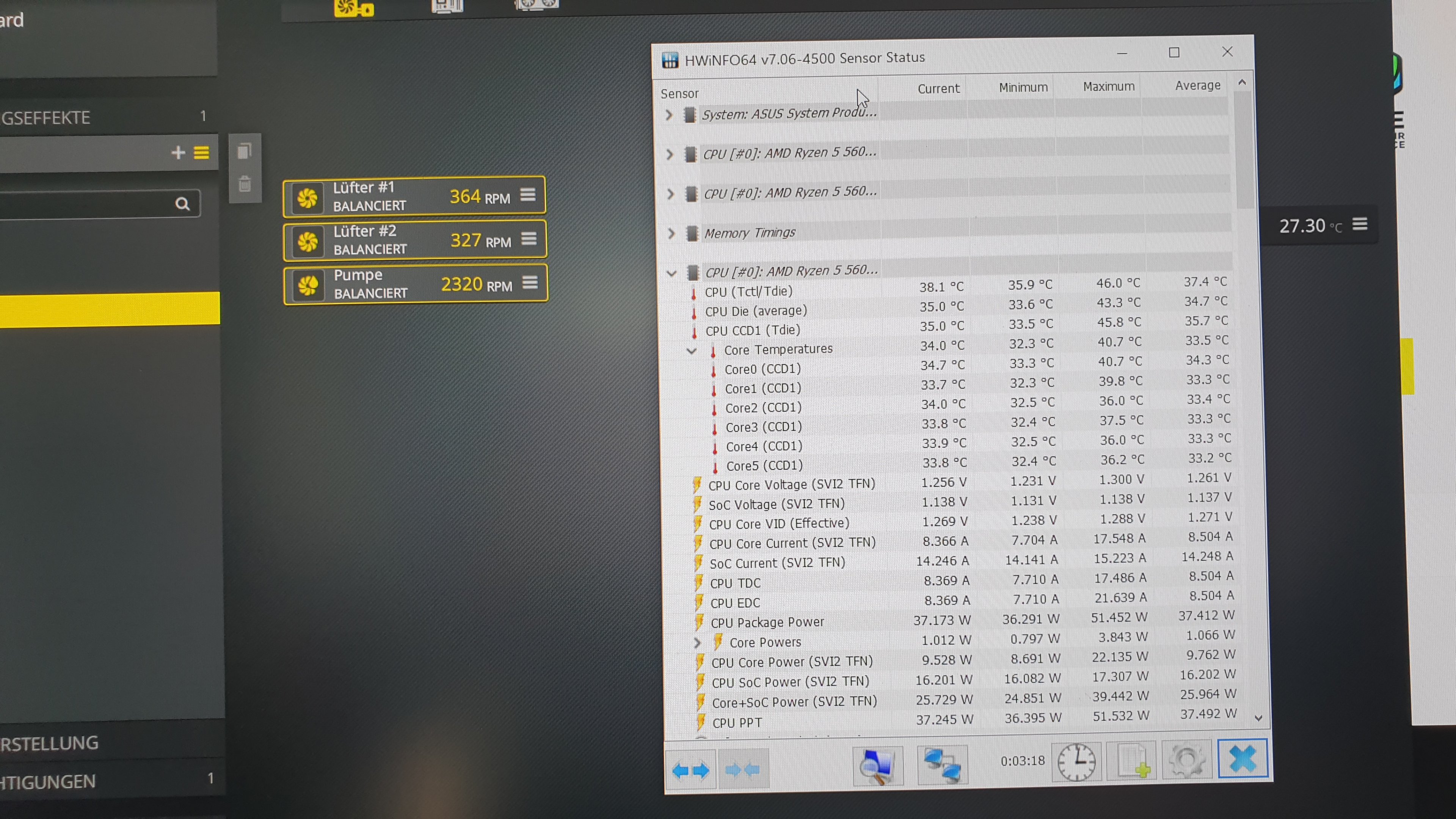 weiß ja nicht, aber deine Werte, nicht nur Temperatur, sehen nicht nach idle aus. Hier mal ein screenshot von mir. (Wasserkühlung Enermax Liquimax III 240 bei ~2000 Umdrehungen Pumpe und ~980 Lüfter)