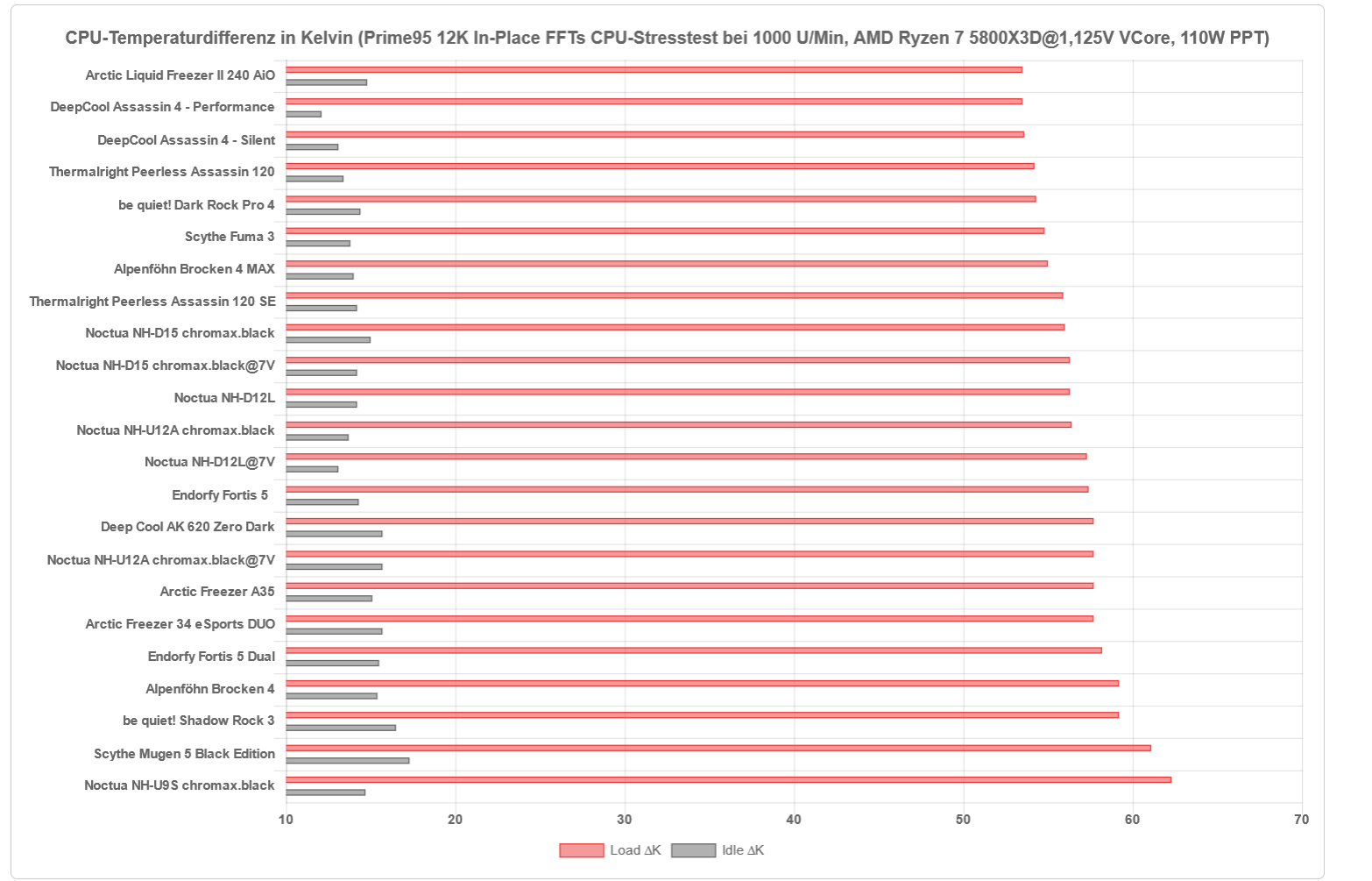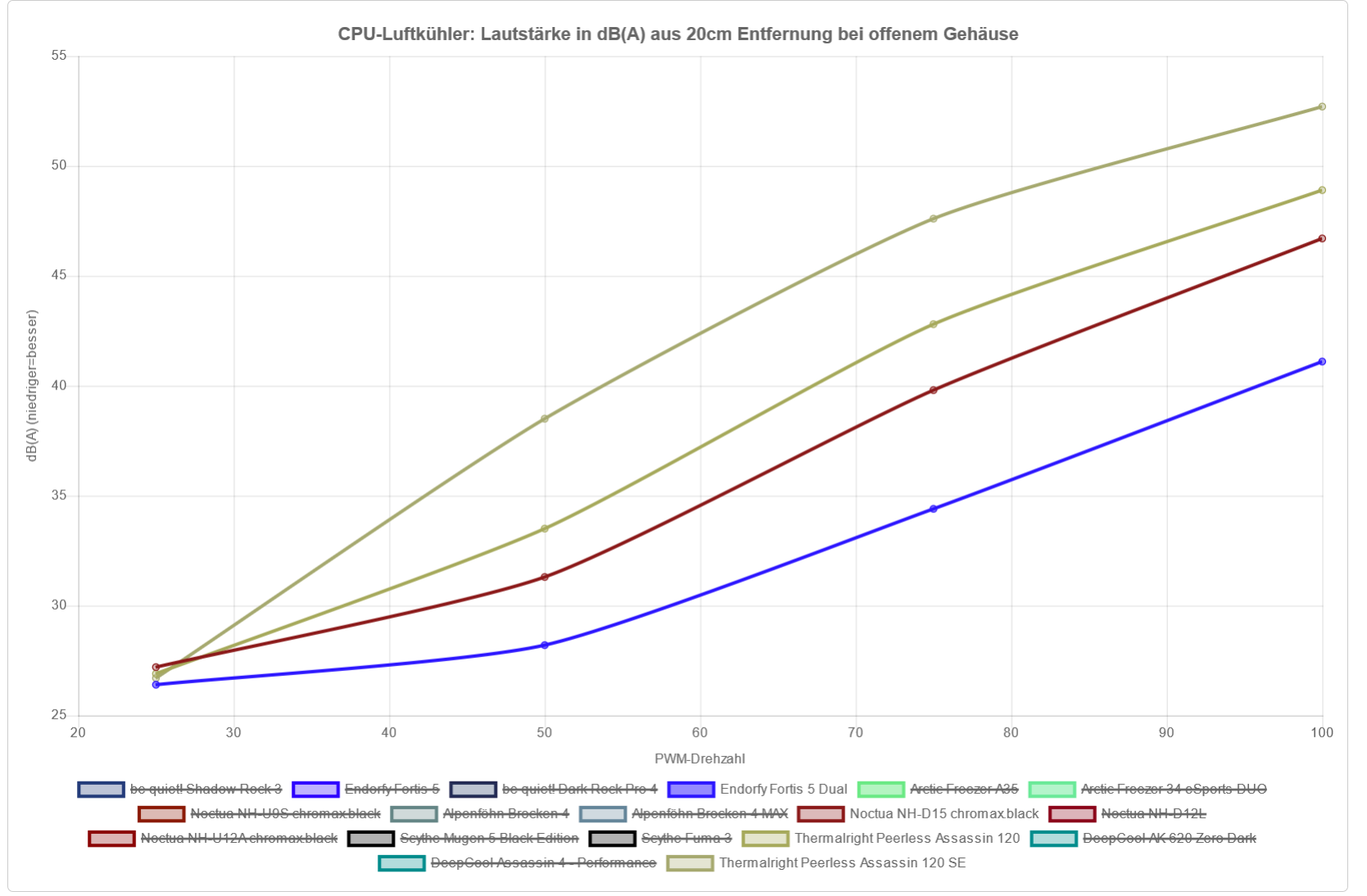 Der Fortis ist damit der leiseste Kühler im Testfeld, leiser als der Shadow Rock 3 und leiser als der DRP 4.