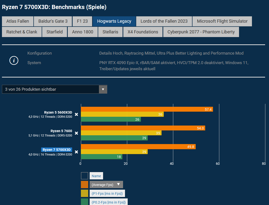 Das deckt sich auch mit meinem 5800X3D und wenn ich den Takt beschneide auf 5700X3D Niveau, dann hab ich noch lange nicht solche Werte wie im PCGH Test - eher wie die von Testing Games ( der Typ besitzt nen PC Shop und bencht alles, was er vorrätig hat ).