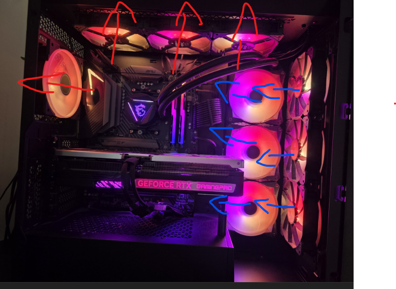 warme Luft steigt nach oben, daher sind die Lüfter oben kontraproduktiv. 🤔nils48231 schrieb:Vorne und oben pustet rein