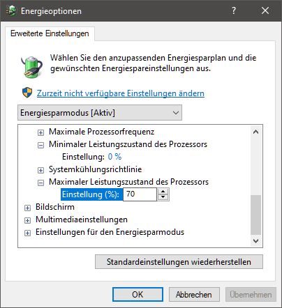 Denn wenn ich bei mir 70% max. Leistung einstelle, sieht es iom Taskmanager dann genauso aus, wie bei Dir.